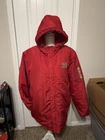 This NFL San Francisco 49ers Puffer Jacket for men is designed in a solid red color with polyester outer shell and lining. It features a hood, full zip closure, and insulated polyester filling for added warmth. The jacket includes pockets for storage and is accented with the NFL team's logo, making it a stylish choice for football fans. Sized as XL, this jacket is perfect for those seeking a cozy and sporty outerwear option to support their favorite team.