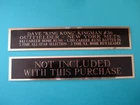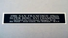 THIS PURCHASE IS FOR THE NAMEPLATE ONLY !!!!!!! BOBBY'S HANG-UPS PREMIUM QUALITY ACRYLIC DISPLAY CASES AND CUSTOM ENGRAVED NAMEPLATES SINCE 1999 THESE NAMEPLATES ARE GREAT FOR DISPLAY CASES, FRAMED AND MATTED PHOTOS, SHADOW BOXES, PLAQUES, ETC. WE SPECIALIZE IN CUSTOM ORDERS OF ALL NAMEPLATES. WHETHER IT'S FOOTBALL, BASEBALL, BASKETBALL, HOCKEY, GOLF, BOXING OR ANY PERSONALIZED NAMEPLATE THAT YOU MAY NEED. WE CAN MAKE JUST ABOUT ANY NAMEPLATE THAT YOU ARE LOOKING FOR. OUR NAMEPLATES ARE TRIPLE ENGRAVED TO GUARANTEE CRISP, READABLE TEXT. NAMEPLATES ARE HAND POLISHED BEFORE SHIPPED TO MAKE SURE THE ENGRAVING REALLY STANDS OUT. ALL NAMEPLATES HAVE HIGH QUALITY DOUBLE SIDED TAPE TO ENSURE IT WILL STAY IN PLACE. PLEASE CHECK OUT OUR EBAY STORE, AND CHECK OUT ALL OF OUR ACRYLIC DISPLAY CASES AND NAMEPLATES. IF YOU DON'T SEE THE NAMEPLATE YOU ARE LOOKING FOR OR IF YOU ARE LOOKING TO PLACE A CUSTOM ORDER, PLEASE FEEL FREE TO EMAIL US AND WE WILL GET WORKING ON YOUR ORDER RIGHT AWAY. THANK YOU! THIS PURCHASE IS FOR A SAN FRANCISCO 49ers NAMEPLATE. IT IS BLACK ON BRASS BACKED ON POLISHED GOLD PLATING. THE NAMEPLATE MEASURES APPROX 1.25" X 6" IN TOTAL WITH ENGRAVED TEXT THAT READS: 1981 SAN FRANCISCO 49ers SUPER BOWL XVI CHAMPIONS Defeated the Cincinnati Bengals 26-21 Bill Walsh ~ Head Coach, Joe Montana ~ M.V.P. IF YOU ARE PURCHASING DIFFERENT TEAM OR PLAYER NAMEPLATES, AND DIFFERENT SIZES AT THE SAME TIME, PLEASE USE THE SHOPPING CART FEATURE AND PLEASE REQUEST A TOTAL BEFORE MAKING PAYMENT TO ENSURE YOU GET THE PROPER COMBINED SHIPPING DISCOUNT. Be sure to add me to your favorites list !