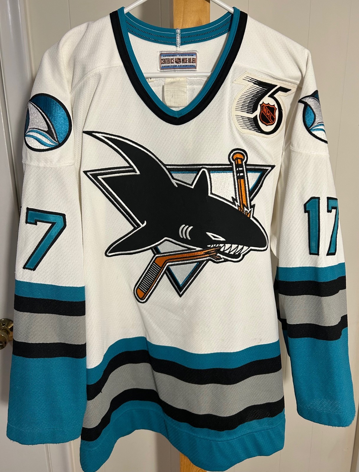 San Jose Sharks authentic NHL "Center Ice" Jersey, as worn 1980's-2000's Authentic Jersey from that era -- All materials are authentic as worn on-ice in 1980's-90's-2000's NHL, including professional weight "Air Mesh" fabric, double shoulders, all seams cover-stitched. All numbers are twill layers and are sewn on, central logo and all patches are embroidered and sewn on. NHL 75th anniversary patch on front. NHL official logo and CCM Logo on back hem. Fighting strap included. Jersey has been professionally cleaned, is in Very Good to Excellent Condition. See exact measurements in pictures. Item in the photo is exactly the item you will receive. Shipping is free. Hangs beautifully and looks great! Note: This Jersey is part of the FAVA Collection being presented by TNC Collections . View the other listings of TNC Collections of authentic and vintage athletic jerseys.
