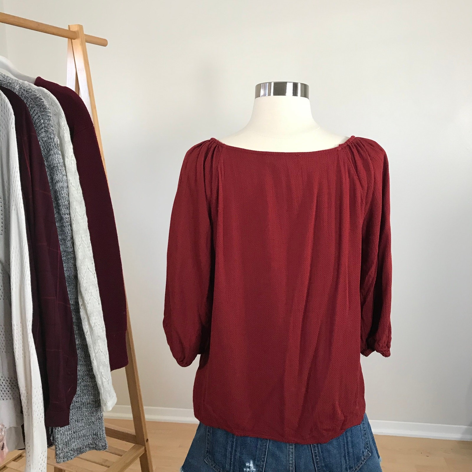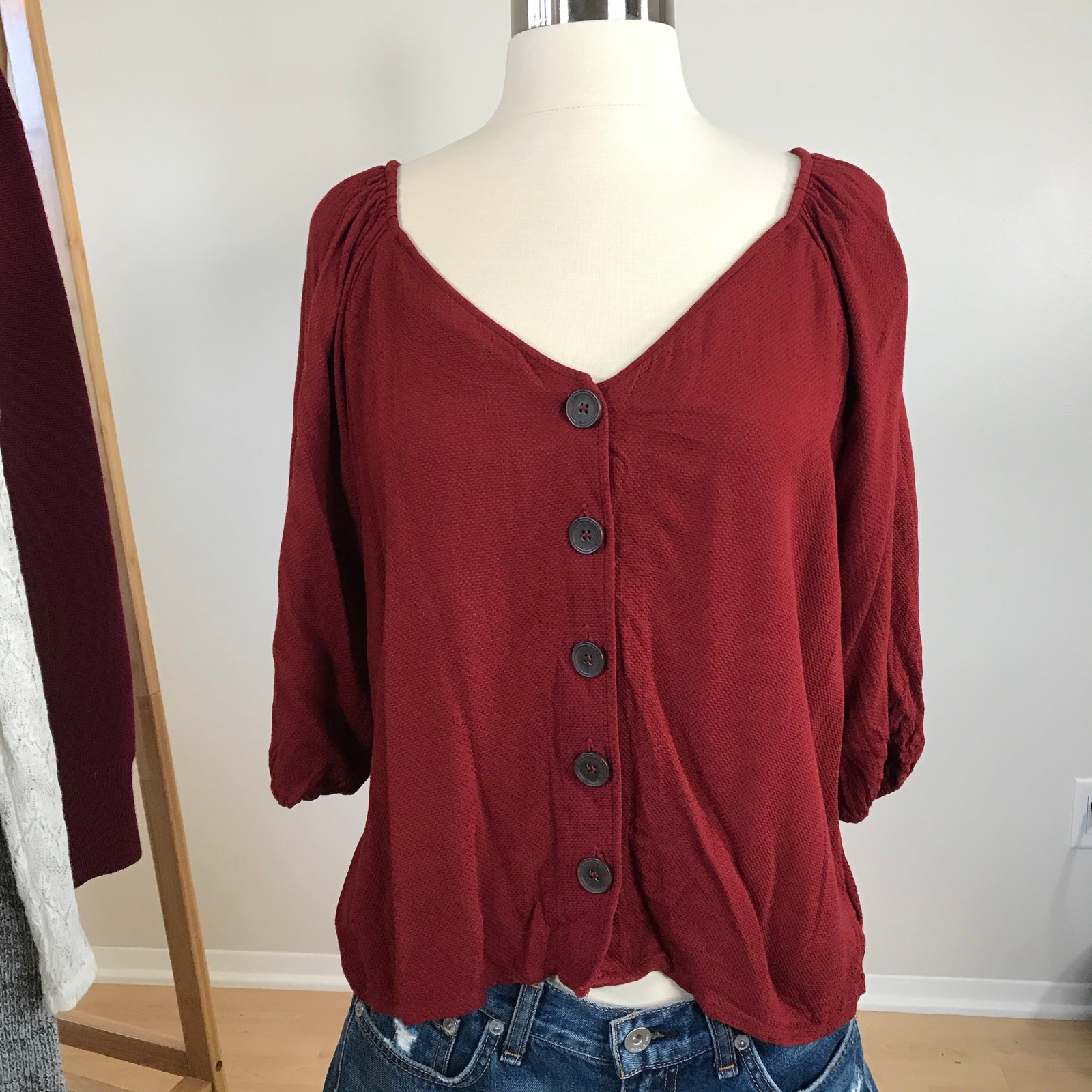 Brand + Style: Sanctuary Modern Button Front Top in Red Jasper Features: Burgundy red button front top, v neckline, 3/4 length gathered sleeves with elastic cuffs, boho peasant style Fabric: 100% Rayon Size Small Excellent pre-owned condition Approximate Flat Measurements: Bust - 21" Length - 22" Sleeve Length - 16" • Smoke free, pet friendly home • Ships next day or sooner • Price negotiable, send me an offer! B5-EDG