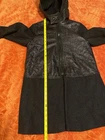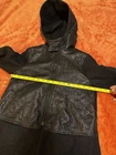 The Sandro Wool Blend Patent Coat is a stylish and high-quality outerwear option for women. Made with a luxurious wool blend outer shell and lining, this black zip-up hooded jacket is perfect for colder weather. The medium size and regular fit make it a versatile piece that can be easily dressed up or down. The overcoat style adds a touch of sophistication to any outfit, while the hood provides added warmth and protection. Perfect for those looking for a fashionable and functional addition to their wardrobe. Measurements seen in photos.