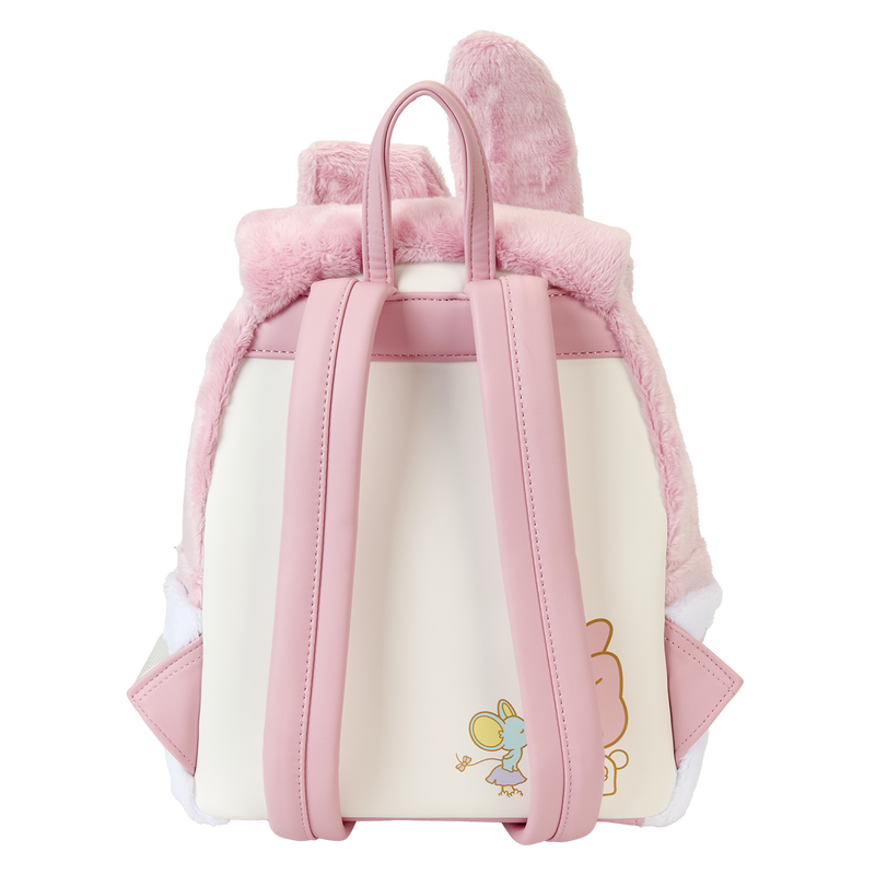 Deliver cookies and almond pound cake to friends in style! Take along this exclusive My Melody mini backpack. The sweetest of details come to life in pink and white plush. The front pocket features My Melody’s tiny paws, which reach up over the top. You can flip them up to reach the zipper pocket behind and secure smaller items for your journeys. Above, My Melody’s adorable face has embroidered and applique features. Her pink ears poke up playfully, and just under her chin, you’ll find another zipper compartment for securing items. Pack what you need for the day and share smiles wherever you go. Features: Vegan leather (polyurethane) Adjustable shoulder straps Sturdy top handle Front zipper pocket Flap zipper pocket Zippered main compartment Gold-colored metal hardware Applique, plush, embroidered, and printed details Coordinating inside lining Dimensions: 9”W x 10.5”H x 4.5”D 22.9 cm W x 26.7 cm H x 11.4 cm D