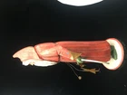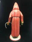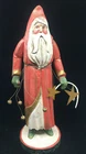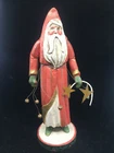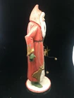 Santa Claus Figurine House of Hatten 1988 Vintage Christmas 15" Tall RARE Missing something. Missing something in his hands. Basket? Any ideas? 15" tall and 4 3/4" base width. Paint chips on top of hood should be easy to touch up. Red robe with Hoodie hood green mittens and boots bells and stars belt is wire. Shelf: #k top