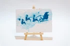 This is an original acrylic painting titled "Reindeer Sleigh Christmas" by artist Marina Fisher. The small unframed piece measures 4 inches in height and 6 inches in width. The artwork features a festive scene of Santa Claus riding a sleigh with reindeer, set in a contemporary, impressionistic style. Handmade in Oregon, USA in 2020, this one-of-a-kind piece is signed by the artist and showcases themes of holidays, Christmas, and adventure. Perfect for art enthusiasts looking to add a unique and charming touch to their space.