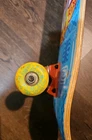 The Santa Cruz SpongeBob SquarePants 7.75" Skateboard Complete is a skateboard featuring artwork themed around the popular cartoon character SpongeBob SquarePants. It is a part of the Santa Cruz brand and suitable for skateboarding. This skateboard does not include any signatures and is not specified to be a specific model. This is used with Bullet trucks and Santa Cruz wheels. Comes from a clean and smoke-free home.