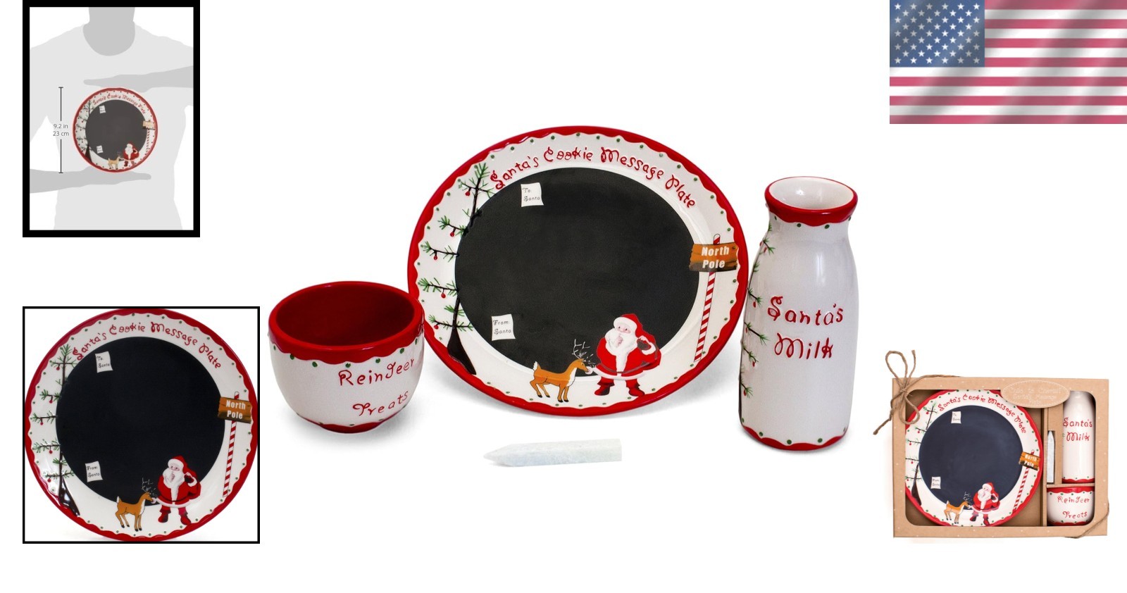 Santa's Cookie Plate Set - Reindeer Treat Bowl Included ‹ › ‹ › ‹ › ‹ › ‹ › ‹ › ‹ › ‹ › ‹ › ‹ › ‹ › ‹ › Santa's Cookie Plate Set - Reindeer Treat Bowl Included Capture the magic of Christmas and start a beloved tradition with this enchanting Santa's Cookie Plate Set, beautifully crafted to make your holiday celebrations even more wonderful. What's Included: Santa's cookie plate Santa's milk jar Adorable Reindeer treat bowl Soapstone chalk for personalized messages on the plate Features: Made from high-quality stoneware for durability and timeless appeal. Dishwasher and microwave safe for effortless cleaning and convenience. Perfectly designed to create lasting memories for your children as they leave milk and cookies for Santa. Includes a charming Reindeer treat bowl, ensuring Santa’s magical helpers receive their fair share of tasty treats too. Benefits: Ignite the spirit of Christmas and create cherished family traditions. This delightful set makes an exquisite Christmas gift for family and friends. Encourages joy, creativity, and excitement in children during the festive season. Crafted from stoneware for lasting beauty and practicality in your home. Why Choose Our Santa's Cookie Plate Set? This delightful Santa's Cookie Plate Set is more than just tableware; it's a heartwarming tradition that your family will treasure for to come. Made from stoneware, it's both functional and festive, ensuring that every Christmas Eve is filled with anticipation and joy. Embrace the magic of the holiday season and create unforgettable memories around the table. Order your Santa's Cookie Plate Set today and enjoy a taste of Christmas cheer! Shipping Free & Fast Shipping - We offer free shipping to most of the USA with a normal delivery time of 3-10 business days. However, due to various situations, additional delivery time (up to 3 weeks) may be required for some items. Alternative Carriers - We may use alternative carriers (e.g. USPS, FedEx, UPS, etc.) to ensure your package arrives safely and on time. Due to the use of multiple carriers, we are unable to provide a tracking number automatically. Handling Time - Orders are processed and shipped within 1-5 business days of receiving cleared payment. Shipping Restrictions - Shipping to Alaska, Hawaii, Puerto Rico, Guam, and other US territories may incur shipping charges or delivery restrictions. Please contact us before ordering, or your order can be refunded/cancelled. State Restrictions - There may be restrictions based on your state of purchase. For example, certain items may not be shipped to California due to state regulations. Contact for Tracking Updates - If you require tracking updates or have any concerns about the delivery of your order, please feel free to contact us, and we will be happy to assist you. Return 30-Day Hassle-Free Returns - We want you to be completely satisfied with your purchase. If you are not, you can return the item within 30 days of receiving it for a full refund or exchange. Easy Return Process - To start a return, simply contact us and we will provide you with a prepaid return shipping label and detailed instructions. Restocking Fee - There are no restocking fees for returns. However, the buyer is responsible for return shipping costs if the return is not due to a seller's error. Refund Processing Time - Refunds will be processed within 5 business days of receiving the returned item in its condition. Payment We accept all major credit cards, PayPal, and Apple Pay for your convenience. Your payment information is secure and encrypted to ensure a safe and seamless transaction. Please complete your payment within 3 days of purchase to avoid any delays in shipping. Feedback Your feedback is extremely important to us. We strive to provide the best products and customer service possible. If you are satisfied with your purchase, please take a moment to leave us a positive review. If you have any concerns or issues with your order, please contact us before leaving negative feedback. We are committed to resolving any problems and ensuring your satisfaction. Contact Us If you have any questions or concerns, please feel free to out to our customer support team. You can contact us through the eBay messaging system. We are available Monday to Friday, 9:00 am to 5:00 pm EST, and we will do our best to respond to your inquiry within 24 hours. Buy it now and enjoy a pleasant shopping experience! Unit Quantity: 3 Material: Ceramic,Stoneware Room: Any Room,Dining Room,Kitchen Care Instructions: Dishwasher Safe,Microwave Safe Type: Centerpiece Occasion: Christmas Color: Multicolor Style: Traditional Item Weight: 3 lb Finish: Semi-Matte