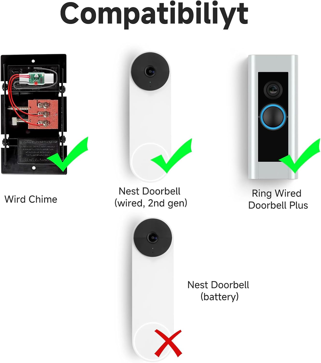 Modern and Practical Design-The Satisure Nest Doorbell sounds an alarm when someone rings the doorbell, so you never miss a reminder on your phone when your home. Wired Doorbell, Wireless Conversion - Upgrade your wired doorbell system to a wireless connection with our wireless transmitter. Say goodbye to the limitations of wired wiring and enjoy greater flexibility and convenience Please note - our wireless doorbells only work with video doorbells such as the Nest Doorbell (wired, 2nd generation)/Ring Wired Doorbell Plus! Easy to Install and Compatible - Our doorbell extender offers simple and quick installation without the need to differentiate between positive and negative cables (voltage is limited to 3-24V, transformer installation is required for out-of-use). Electronic, electromechanical , Wired doorbell compatible, and the mini size is compatible with Doorbell Push Buttons Wide Coverage - The doorbell extender covers up to 656 feet. Whether you're working in your garage or doing yard work in your backyard, you won't miss any visitors Variety of Chimes and Adjustable Volume -To cater to your personal preferences, our doorbell receiver features 58 different chimes and offers 5 volume levels (0-110dB) Outstanding After-Sales Guarantee - We offers a 30-day refund guarantee and a dedicated after-sales service team, ensuring your peace of mind. Feel to reach out to us anytime if you have any questions or concerns. We are committed to providing excellent service Product Description