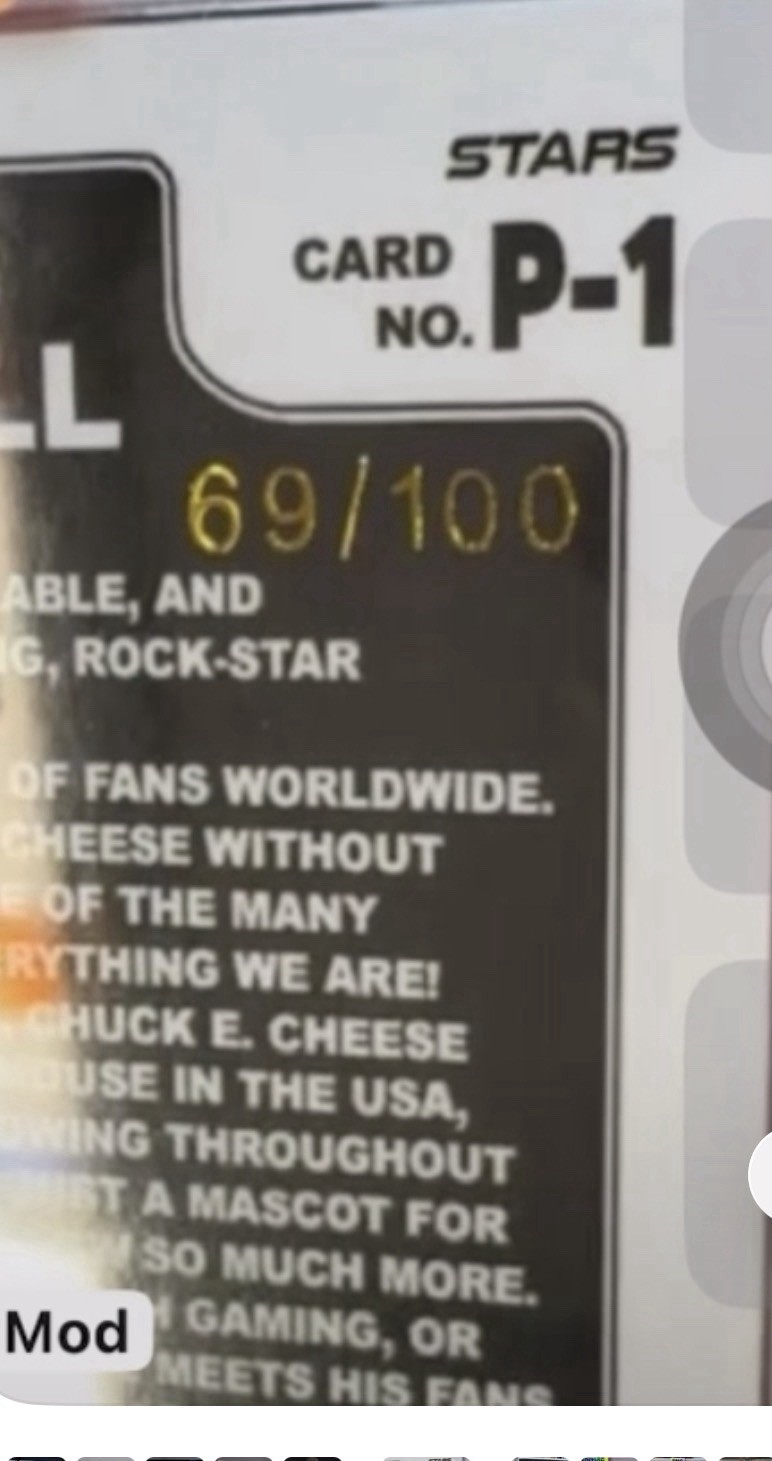 The product is a non-sport trading card featuring characters from Chuck E Cheese's franchise. This specific card is a variation of the Star wall stars design, with a print run of 100. It is in near mint or better condition, making it a desirable collectible for fans of Chuck E Cheese's and trading card enthusiasts alike. With only 69 out of 100 cards in existence, this rare and unique item would make a valuable addition to any collection.