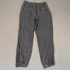 The Anthropologie Women's Medium Gray Elastic Waist Lounge Jogger Pants are perfect for a relaxed and comfortable style, ideal for casual occasions or travel. Made from lightweight and breathable rayon material, these tapered leg jogger pants feature a high-rise waist with an elastic waistband for added comfort. The solid gray color and flat front design make them versatile for various seasons, while the inclusion of pockets adds functionality. Whether you're heading to the beach or simply lounging around, these jogger pants offer a bohemian vibe with a touch of Anthropologie style.