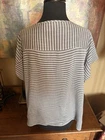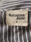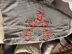 The Savanna Jane Floral Embroidered Gray and White Striped Blouse in size 1X is a stylish women's top perfect for traveling or casual occasions. This blouse features a V-neckline, short sleeves, and is made of lightweight rayon material, making it suitable for summer, fall, and spring seasons. The embroidered flower accents add a touch of detail to the gray and white striped design, giving it a feminine and relaxed fit. Hand wash only to maintain its quality, this blouse from Savanna Jane is a must-have for any wardrobe for its basic yet chic style. Pit to pit is approximately 25-1/2” 51” around.