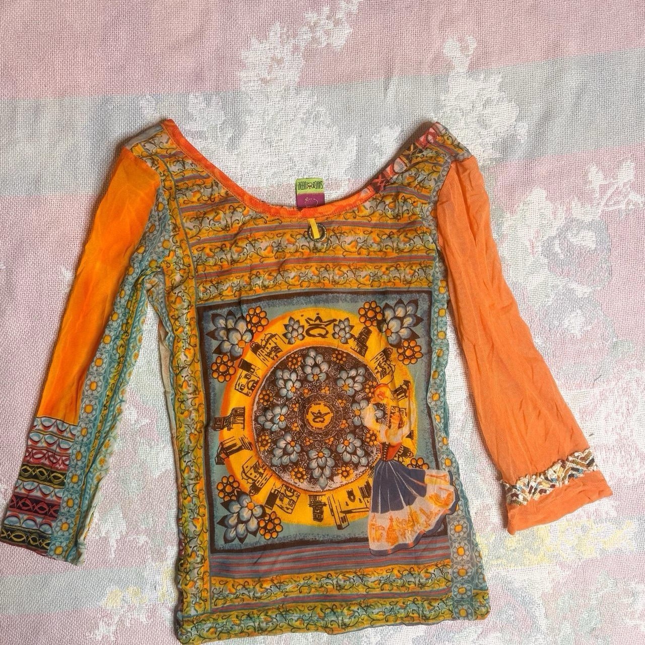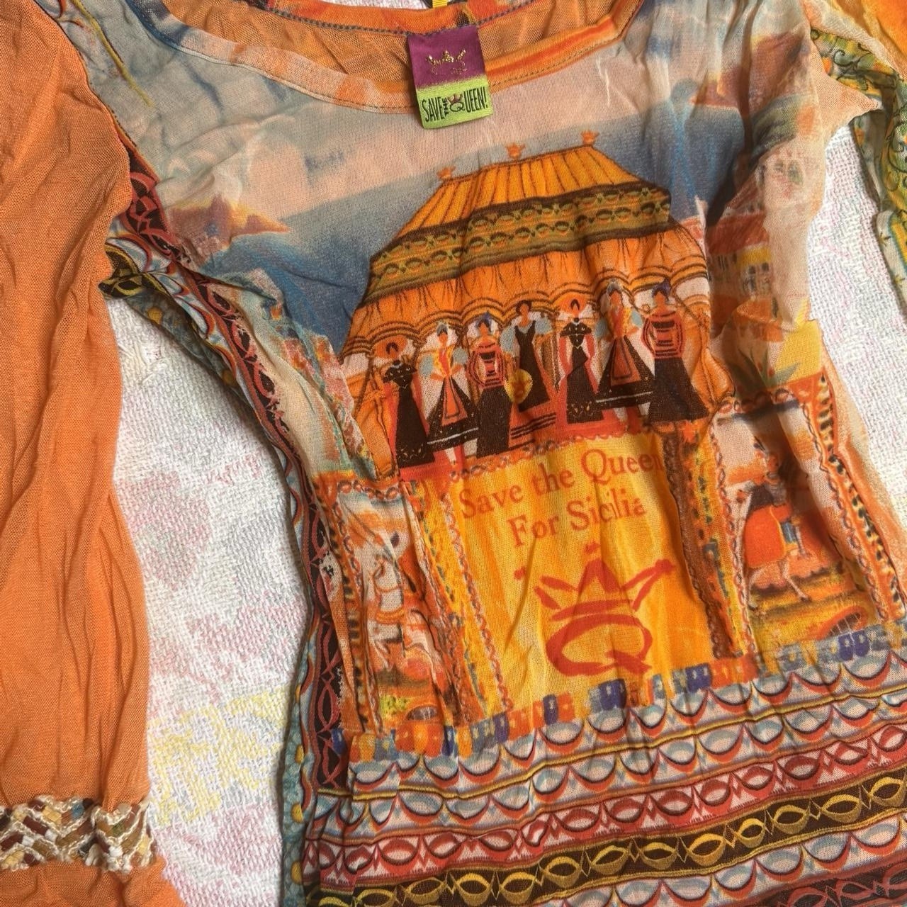 The Save The Queen Archive Sicily Mesh Top is a stylish and colorful geometric patterned t-shirt with 3/4 sleeves, perfect for casual occasions. Made of lightweight and stretchy mesh fabric, this vintage-inspired top features a designer touch with an Italian origin. The multicolor design and Barbie-inspired character make it a versatile piece for all seasons, suitable for both winter and summer wear. The basic style with a touch of artistry makes it a unique addition to any woman's wardrobe. Save The Queen y2k European rare siciliy print micro-mesh graphic top with quarter sleeves Size M/L (marked L) 15.5”-20” ptp 22.5” length Cut interior tag #y2k #euro #avantgarde #goingour #rave
