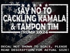 Item Specifics This is a custom Say No To Cackling Kamala & Tampon Tim Trump 2024 vinyl car/truck window decal bumper sticker. Please choose the size and color of the decal from the drop down menus. They are made to go on the outside of a window, bumper, fender etc, can be made to go on the inside upon request. Custom sizes on request please contact me for cost on larger sizes. They are made to go on the outside of a window, bumper, fender etc, can be made to go on the inside upon request (inside application will make it harder to see from the outside, especially if you have tinted windows). The pictures show the decal in white, if you choose a different color the white shown in the pictures will be that color. If you are putting it on a vehicle window a lighter color works best. Darker colors do not show up very well on vehicle windows, even if they are not tinted. Can be applied to any smooth surface, there is no background so the American flag or the black background shown in the pictures is not part of the decal, the surface the decal is applied to will be the background. Made of high quality 5~7 year vinyl, that will not fade or crack, the NEON colors are meant to be used indoors and will fade quickly if applied outdoors in the weather . Once applied do not scrape ice or use high pressure directly on the sticker, normal car washes are ok. Picture is for reference to show how the sticker will look on a vehicle rear window and may not be to scale. This is an adhesive decal and not a cling, once applied it can not be removed and reused. Easy to apply, application instructions included. Shipping Information I will combine shipping on multiple items. USA shipping includes online tracking. International buyers, please check the rate calculator prior to bidding. International Buyers – Please Note: Import duties, taxes and charges are not included in the item price or shipping charges. These charges are the buyer’s responsibility and imposed by your country not by me or ebay. Please check with your country’s customs office to determine what these additional costs will be prior to bidding/buying. These charges are normally collected by the delivering freight (shipping) company or when you pick the item up – do not confuse them for additional shipping charges. We do not mark merchandise values below value or mark items as ‘gifts’ – US and International government regulations prohibit such behavior. Be sure to add me to your favorites list !