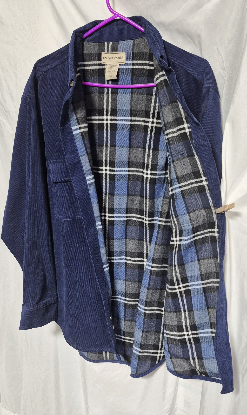 Crafted for comfort and style, the Scandia Woods Jacket offers a unique blend of blue corduroy and plaid flannel lining. This men's large jacket combines a relaxed fit with a classic shirt style, creating a versatile piece for your casual, workwear, or travel wardrobe. The warm flannel lining accentuates the jacket's cozy feel, making it ideal for the cooler seasons of fall, spring, and winter. The jacket features a solid and plaid pattern with a button-down collar and button closure, ensuring a secure and snug fit. It's machine washable for easy care and designed to keep up with various outdoor activities such as hiking, hunting, riding, or simply strolling through town. Whether you're aiming for a rugged outdoorsy look or a more polished ensemble, this Scandia Woods jacket is a dependable addition to your clothing collection.