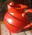 1920's or 30's chrome red water pitcher with a more scare ice catcher edition. It measures 8.5" tall by 9" wide and in overall excellent condition. There are probably a few flecks but no real chips,cracks or repairs.