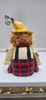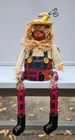 Scarecrow Shelf Sitter, Jack-o-Lantern Pumpkin Head, Vintage Dangling Legs, Patchwork Hat, Overalls. Cool Halloween Fall Decor. Cute piece! 🎃 11" tall x 5" wide