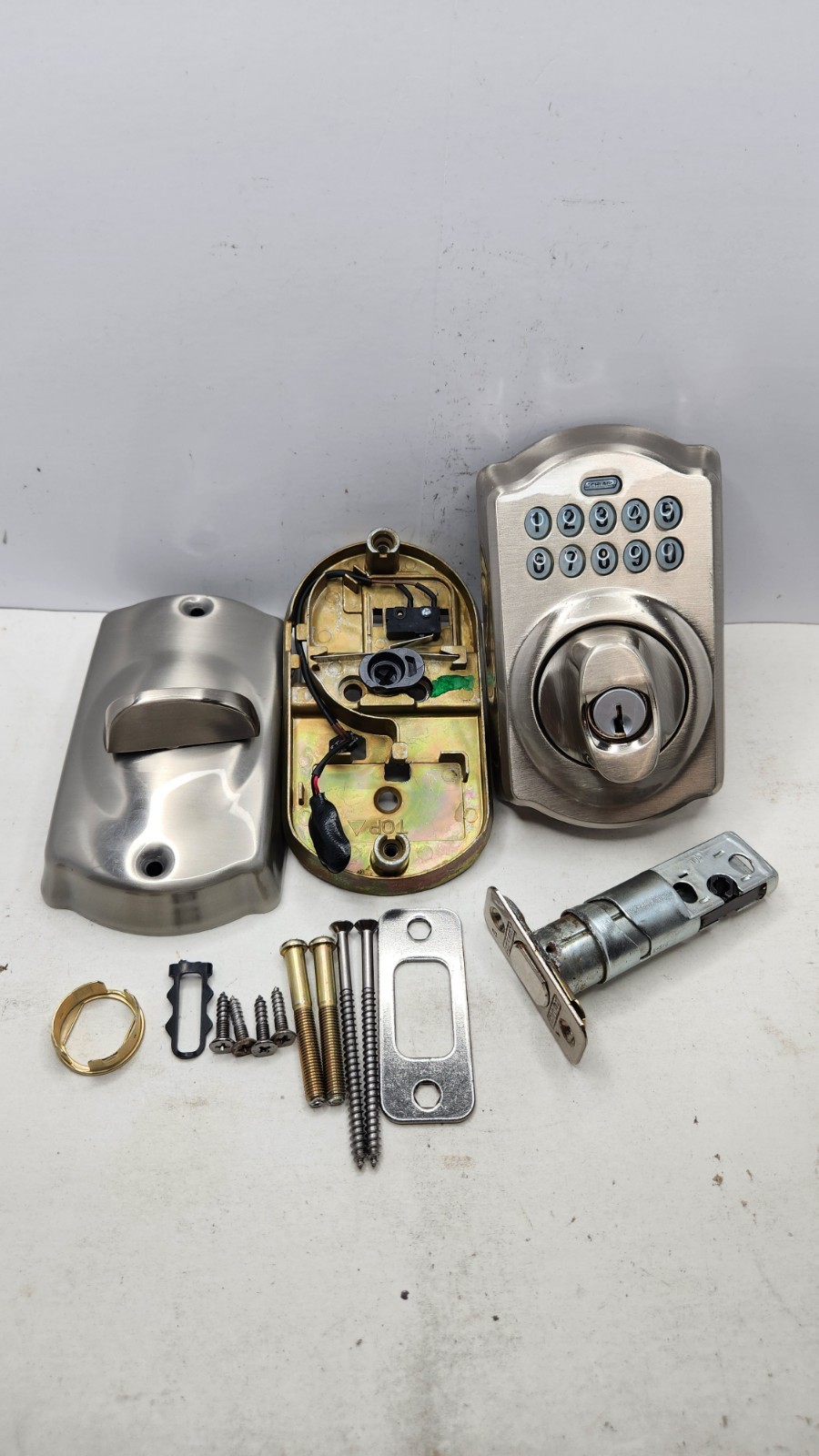 PARTS ONLY ( POWERS ON , LOCKED UP ) The Schlage BE365 Camelot Keypad Electronic Keyless Entry Deadbolt Lock is a stylish and secure option for your front door. With a sleek satin nickel finish and a keyless keypad for easy entry, this deadbolt offers convenience and peace of mind for your home. It requires a 9-volt battery and is made of durable brass and nickel materials, ensuring longevity and resistance to wear and tear. The Camelot Keypad design adds a touch of elegance to your door, making it both functional and visually appealing.