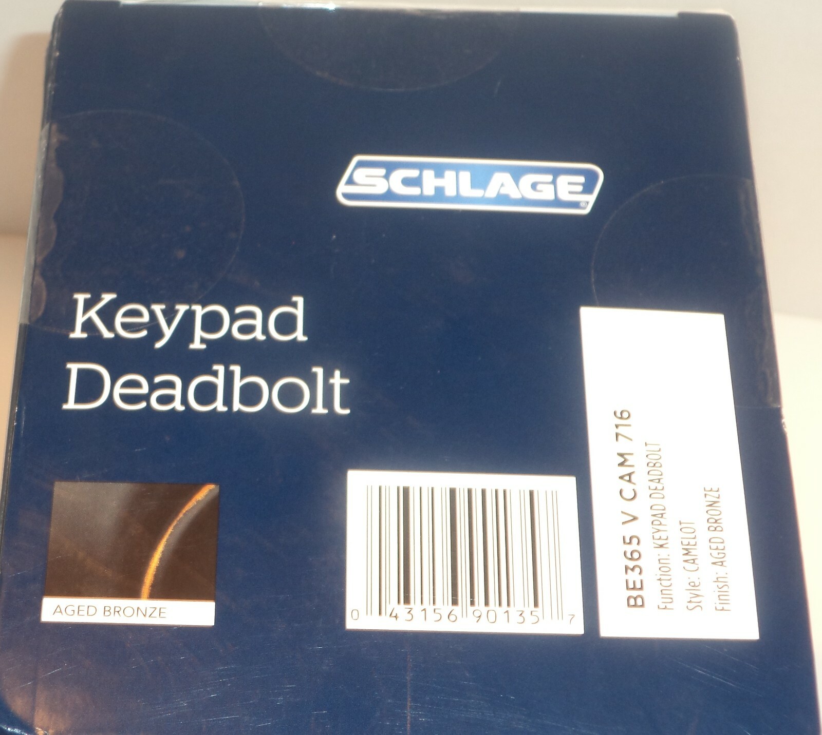 You are Buying a Brand New And Factory Sealed Schlage BE365VCAM716 Camelot Keypad Deadbolt, Aged Bronze by SCHLAGE Product description Style: Camelot Keypad | Color Name: Aged Bronze | Product Packaging: Standard Packaging Camelot, Aged bronze finish keypad deadbolt, fits most standard door preps, 9V battery operation, easy 1 tool installation. Graded Best in Security, Durability, and Finish Create and delete access codes for trusted friends and family (up to 19) Installs in minutes no wiring needed Guaranteed to fit on standard doors; Customizable to fit your security needs Silicone coated keypad prevents numbers from wearing off. Door thickness range 1 3/8 inch (35 millimeter) to 1 3/4 inch millimeter); Ideal for front doors, side & back doors, garage entry doors, etc Pairs with our most popular trim styles to coordinate the look throughout your home; Back set: Universal latches and deadbolts fit 2 3/8 inch (60 millimeter) or 2 3/4 inch (70 millimeter) back sets On Apr 4, 2025 at 23:55:01 PDT, seller added the following information: