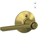 The Schlage F40-LAT Latitude Privacy Door Lever Set in Brass features a round contemporary design. This door hardware item is manufactured in Mexico and comes with a California Prop 65 Warning. It is a stylish and functional addition to any home, offering privacy and security with its innovative lever set.