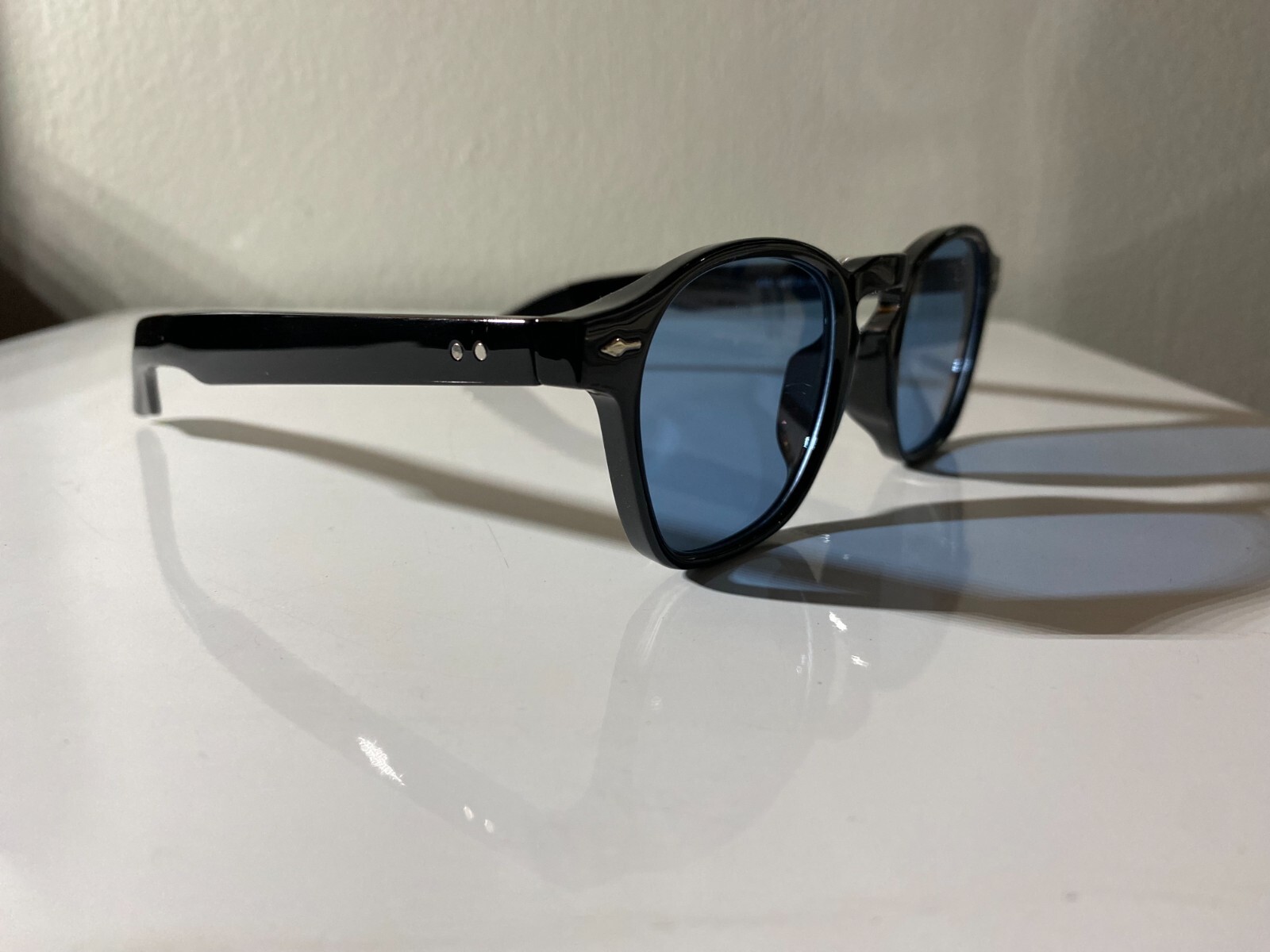 Philosophical style men's sunglasses with black frame and blue lenses. Great price, no joke.
