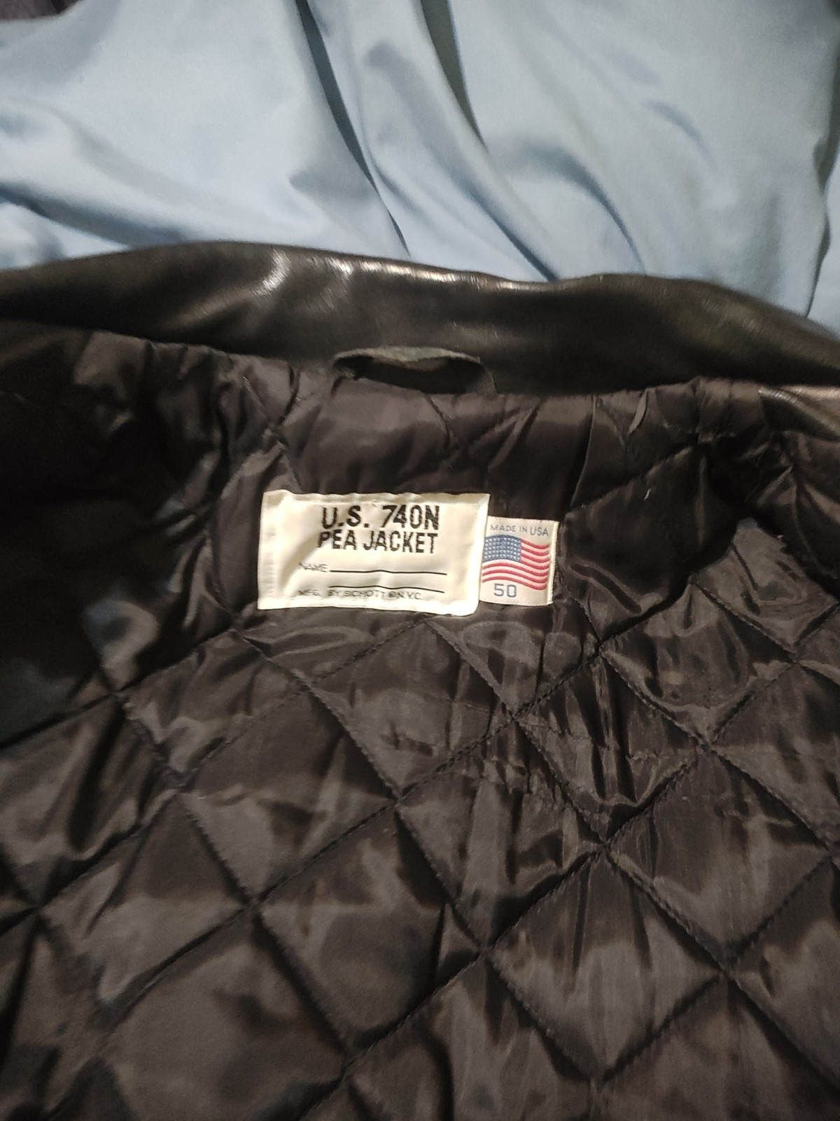 The Schott Black Leather Pea Coat 740N is a stylish men's jacket made in the USA. It features a classic pea coat style with a regular fit and a size of 50 . The outer shell is made of high-quality black leather, adding durability and a sleek look to the jacket. With its timeless design and superior craftsmanship, this Schott jacket is a versatile outerwear piece that embodies American heritage and style.