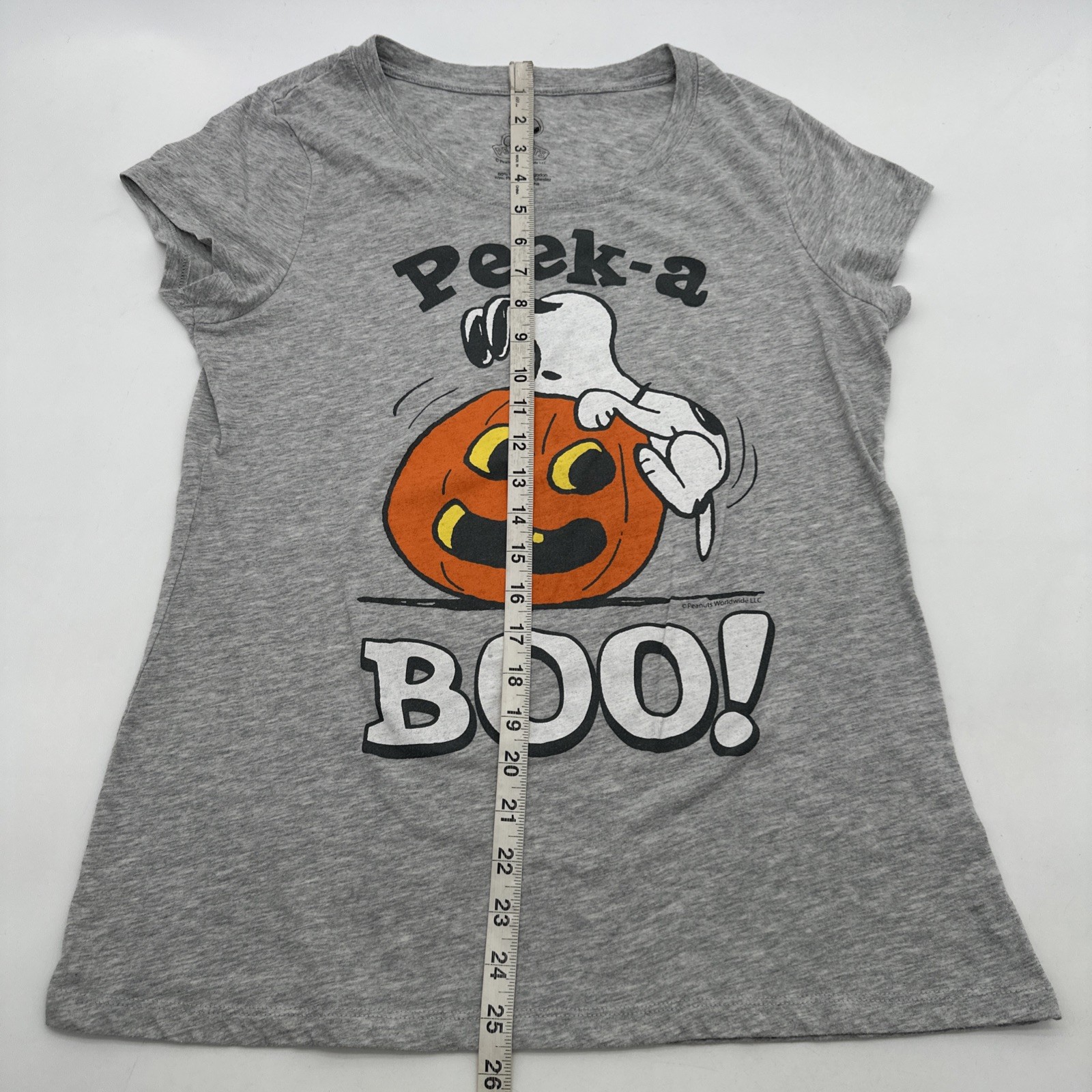 This Peanuts By Schulz T-shirt for women in size 2XL features a solid gray color with a graphic print of the Peanuts logo. The shirt has short sleeves, a round neckline, and a pullover closure, making it perfect for casual occasions. Made of a comfortable blend of polyester and cotton, this relaxed fit shirt is a great addition to any fan's wardrobe, with a cartoon theme that is ideal for all seasons. Perfect for summer, fall, and spring, this basic style top is a must-have for any Peanuts enthusiast. Check pictures for flaws and measurements