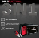 Schumacher Electric SPR1628 3-in-1 Battery Charger - 8A, 6/12V - Cars, Motorcycles, Marine 3-in-1 Device: Combines a battery charger, maintainer, and desulfator Boost Battery Health: The Schumacher Pro SPR1628 features multi-stage charging and float mode monitoring for maintaining optimum battery health and extended battery life Advanced Charging Algorithm: Multi-stage charging employs an advanced charging algorithm to maximize battery charge, battery health, and the lifespan of your battery Float Mode Monitoring: While in float mode, the SPR1628 battery charger delivers a small current when necessary to keep the battery fully charged Auto Voltage Detection: The Schumacher Pro SPR1628 automatically detects the voltage of connected 6-volt and 12-volt batteries, for easy, worry-free charging Maintain Stored Batteries: Keep stored or infrequently used batteries fully charged and in top condition with the Schumacher Pro SPR1628 battery maintainer Reverse Hook-Up Protection: With built-in advanced reverse hook-up protection, the charger protects against damage if the clamps are not properly connected When you receive your order and have any queries or concerns about the product, feel free to message us. We guarantee 100% resolution for you. Our commitment is to provide high-quality products and exceptional customer service, ensuring your trust and satisfaction.