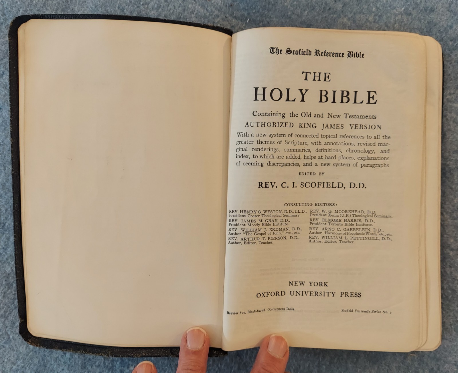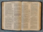 Scofield Reference Bible King James Version KJV Study Vintage Leather Oxford Univ Press The Scofield Reference Bible THE HOLY BIBLE Containing the Old and New Testaments AUTHORIZED KING JAMES VERSION With a new system of connected topical references to all the greater themes of Scripture, with annotations, revised marginal renderings, summaries, definitions, chronology, and index, to which are added, helps at hard places, explanations of seeming discrepancies, and a new system of paragraphs Edited by Rev. C. I. Scofield, D. D. OXFORD UNIVERSITY PRESS Brevier 8vo. Black-faced – References India Scofield Facsimile Series No. 2 Copyright 1909, 1917; renewed, 1937, 1945 Oxford model code (inside third sheet from the back): T-71 183X Printed in the United States of America Cover : believed to be leather but it is not labeled/stamped inside. The cover looks like leather, especially examining the worn areas, but I am not an expert on Bible covers. I guess it could be imitation leather; probably not bonded leather (too old for that newer technology). Blue/Navy Blue Size : 5 ¾ x 8 ½ x 1 ¼ inches Pages : Old & New Testaments with Index, 1362; Dictionary of Scripture Proper Names, Subject Index and Concordance, and Index to the Bible Atlas, 255; Color Bible Atlas, 12 · See the photo with the coin to judge the size of the print. Features : · Black Letter Edition (not Red Letter) · Section introductions (such as The Pentateuch, The Historical Books, etc.) · Book introductions to each Book of the Bible · Subject Reference System · Center-Column References, including definitions, cross-references, etc. · Footnotes, including summaries and explanations · Dictionary of Scripture Proper Names · Subject-Index · Concordance · Index to Maps · Color Maps Gold-gilt finish on the page edges This Bible is in good condition. The cover is a bit worn. Please see the photos. General scuffing and around the edges & corners. There is wear and small cracks at the top and bottom of the spine. The binding is good. There are notations on the first couple pages and three pages at the back. Marks are observed on 27 pages of the Bible text. The gold-gilt finish on the page edges is a bit scuffed and scratched.