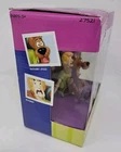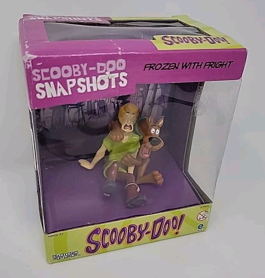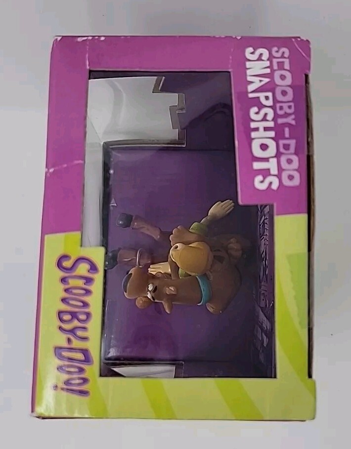 This is a vintage Scooby-Doo Snapshots Shaggy action figure from the Cartoon Network Frozen with Fright series. It features Shaggy and Scooby-Doo characters in a multi-color plastic material. The figure is boxed and depicts a scene from the Scooby-Doo TV show. It was manufactured in 2001 by Warner Bros. Animation and is an original product from the Scooby-Doo franchise.