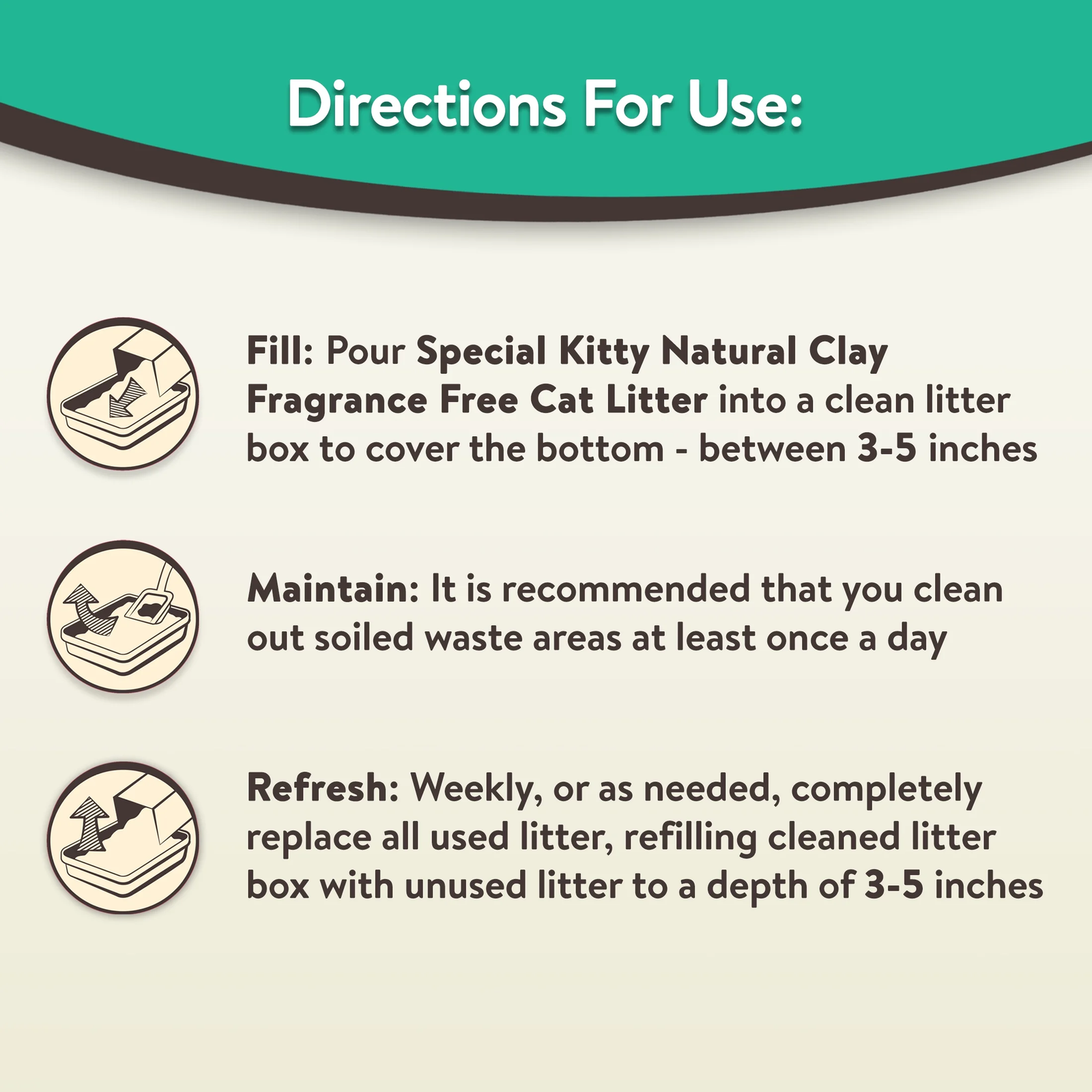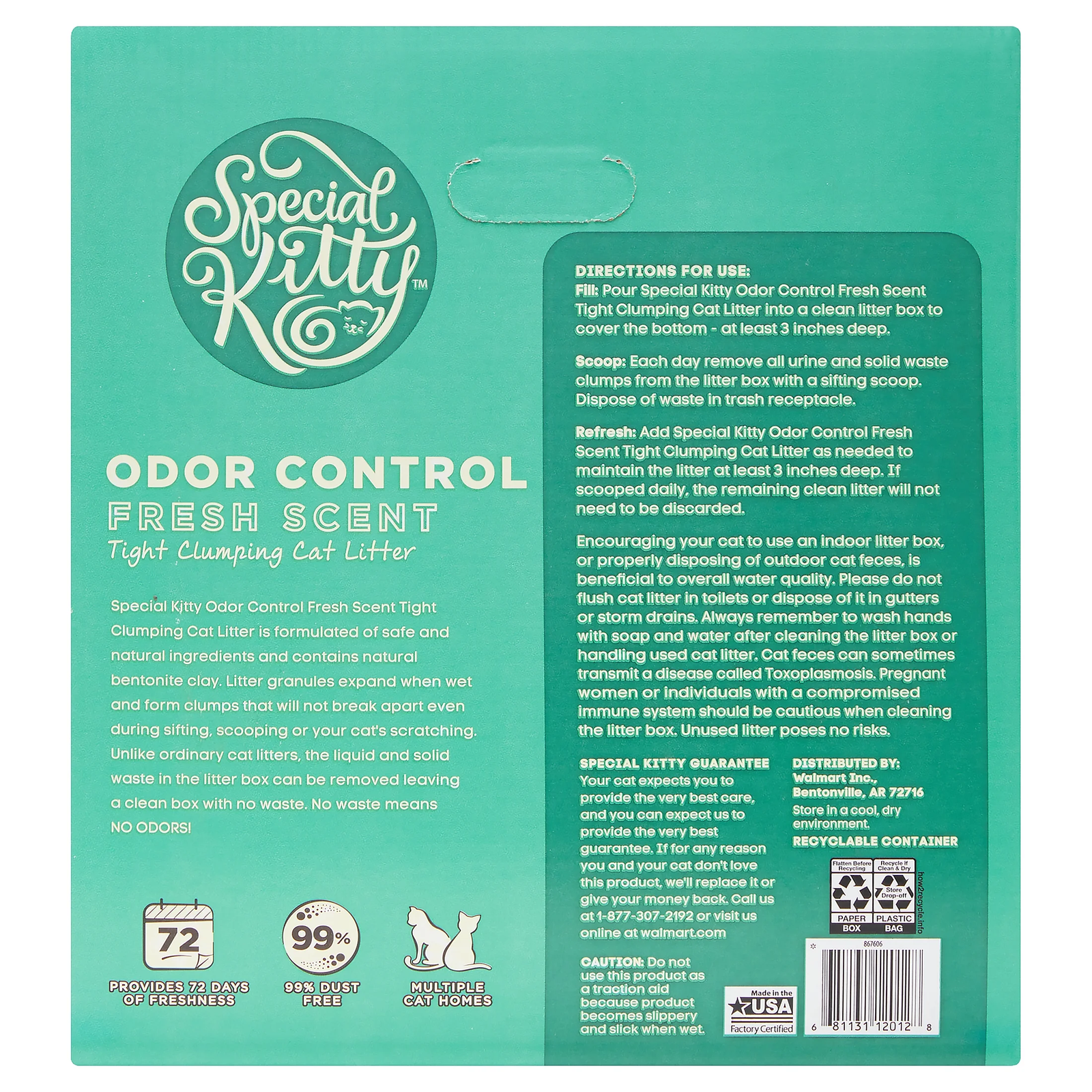 Special Kitty Scoopable Tight Clumping Cat Litter, Fresh Scent provides long-lasting freshness to keep your catâs personal area exactly that. Fill your catâs box with a fresh set of litter and notice the difference immediately when you pour, as this litter is 99% dust-free, and is sure to keep your air clear every time you refill your catâs box. This 40-pound box is optimally made to store away neatly and includes a handle hold for convenient maneuverability and easy pouring. Grab an environmentally-friendly box of Special Kitty Scoopable Tight Clumping Cat Litter, Fresh Scent and enjoy the new-found simplicity of tending to your catâs needs.Special Kitty Promise: At Special Kitty we know that cats rule, and your cat is confident you would only serve her the very best food. That's why each one of our high-quality varieties not only uses wholesome ingredients that support your cat's health, but taste so delicious your cat may actually reward you with a smile. You can always trust Special Kitty to provide nutritious premium products that your cat will crave. It's the Special Kitty promise to you and your cat. Special Kitty Odor Control Tight Clumping Cat Litter, Fresh Scent, 40 lb: Long-lasting fresh-scented smell control to keep your home smelling fresh 99% dust free for a cleaner pour The litter's tight clumping formula makes scooping your cat's box a breeze Great for multiple cats 40-pound box includes hand holes for convenient maneuverability and easy pouring The cardboard packaging makes for an environmentally friendly choice in cat litter Special Kitty Scoopable Tight Clumping Cat Litter, Fresh Scent, 40 lb:Long-lasting fresh-scented odor control to keep your home smelling fresh99% dust free for a cleaner pourThe litter's tight clumping formula makes scooping your cat's box a breezeGreat for multiple cats40-pound box includes a handle for convenient maneuverability and easy pouringThe cardboard packaging makes for an environmentally-friendly choice in cat litter Ingredients Ingredients:Sodium Bentonite Clay, Fragrance./div>