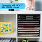 WARNING : California’s Proposition 65 Product Description The overall size of scrapbook paper organizer: 13"L x 12.2"W x 13"H. The size of each slot: 12.2"W × 11.8"D × 0.9"H. Suitable for 12" x 12" paper sheets. Material: Crafted from 5 mm black PVC foam board, very sturdy and durable. Compatible with a 13” x 13” IKEA cabinet. Space Optimization - The scrapbook paper holder is specifically crafted to make the most of your 13" x 13" cabinet, ensuring that every inch of space is utilized efficiently. Each compartment of the IKEA cabinet can accommodate one scrapbook paper organizer. You can effortlessly organize and access your scrapbook, paper, cards, and other stationery items. Keep your workspace tidy and efficient by making the most of your IKEA cabinet's storage potential.