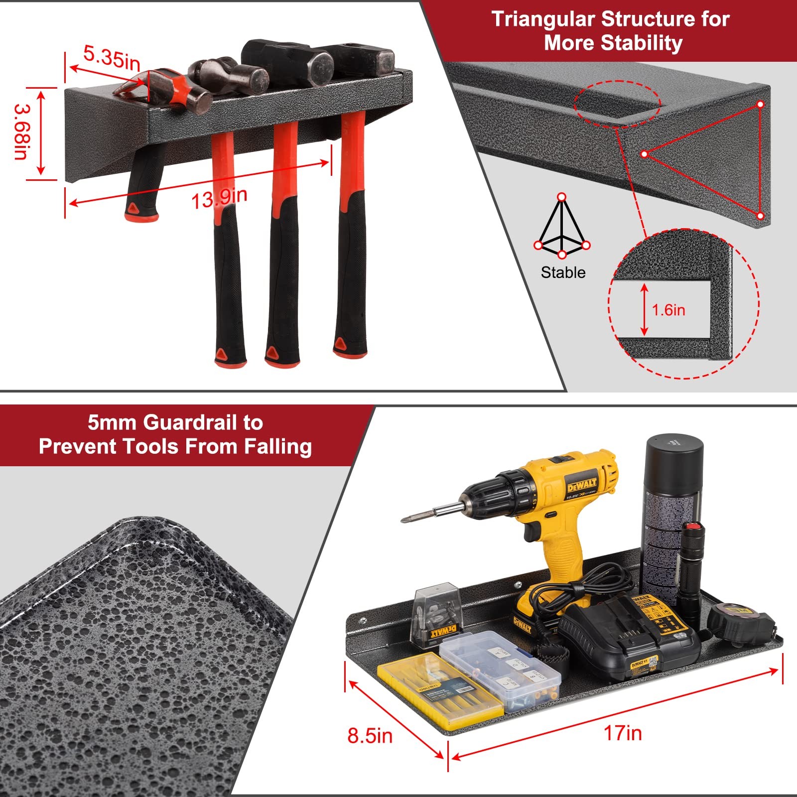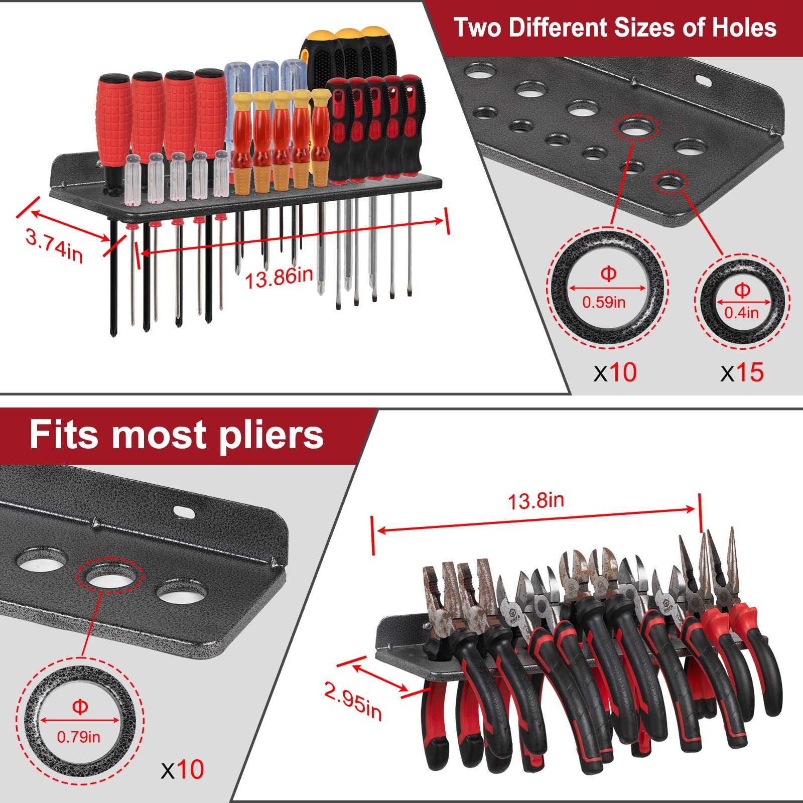 Screwdriver Organizer, Metal Plier Organizer Hammer Rack Pegboard Screwdriver Holder Hand Tool Organizer and Storage Rack Wall Mount for Garage Workshop Workbench - 4 Pack Organize & Saving Space: 4 Packs screwdriver organizer wall mount helps you organize your messy workbench, perfectly organize all the tools, making it visible and within easy reach. It’s a great idea for keep your tools neatly organized and out of the way. (Package only includes the tool storage rack, not include the tools in the picture) Large Storage Space: 4 Pack tool holder wall mount of diversified and vertical design can holder screwdrivers pliers hammers and other accessories such as power tool battery chargers, drill bits, spray paint, tape measures, etc, suitable for most daily tools. Strong and Durable: Compared with wooden tool storage racks, our metal tool storage racks are more durable, will not rot and crack, rust-proof, and have a strong load-bearing capacity. The surface is treated with a spotted pattern, which is more beautiful. Easy to Install: The package contains mounting accessories such as screws. You can easily mount the hand tools organizer on the ,concrete, brick wall, wooden cabinet, or any other place. Great for installing in garage, workshop, workbench. Perfect Gift: This tool organizer is especially suitable as a Father's Day gift and birthday gift for father, husband, and friend.