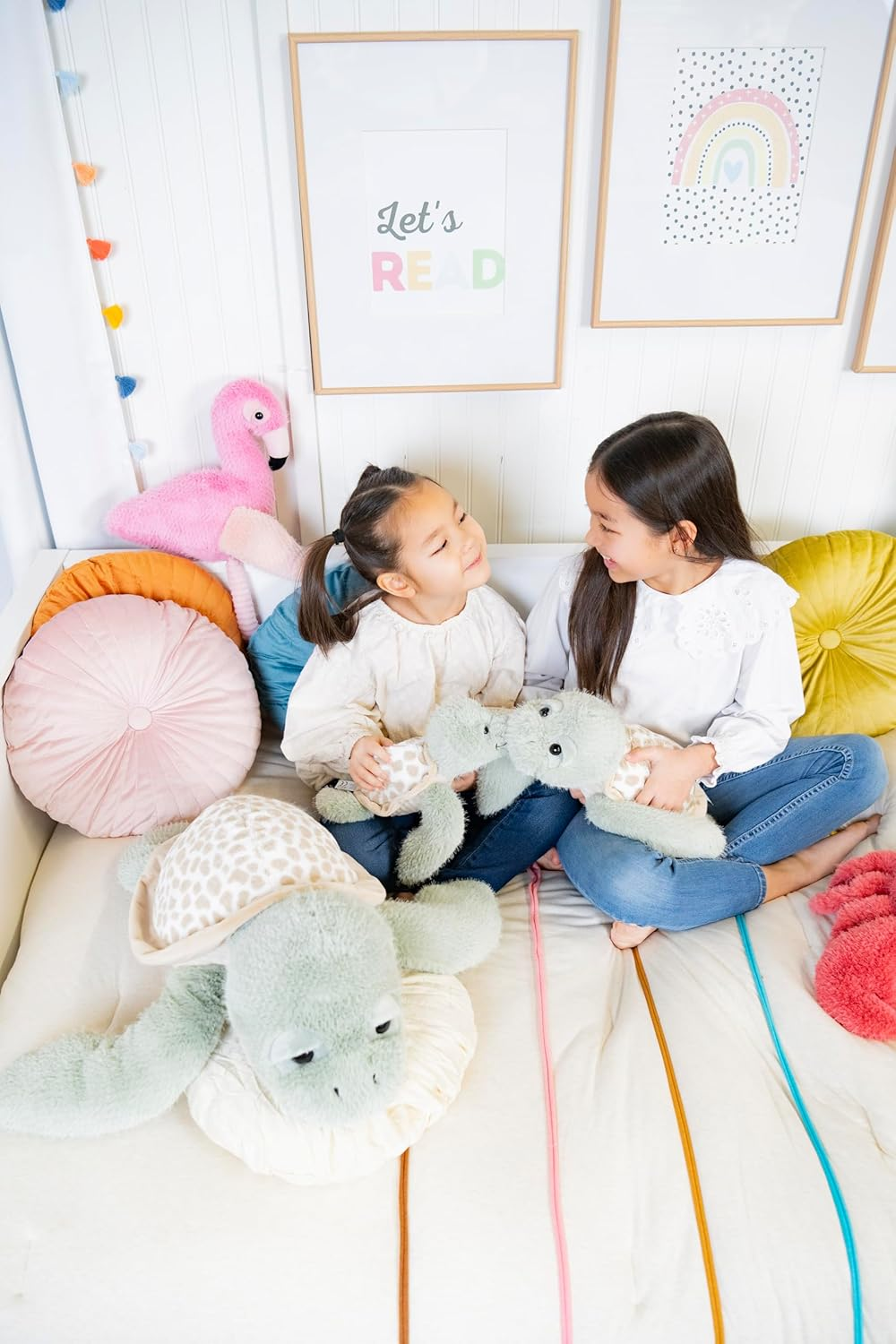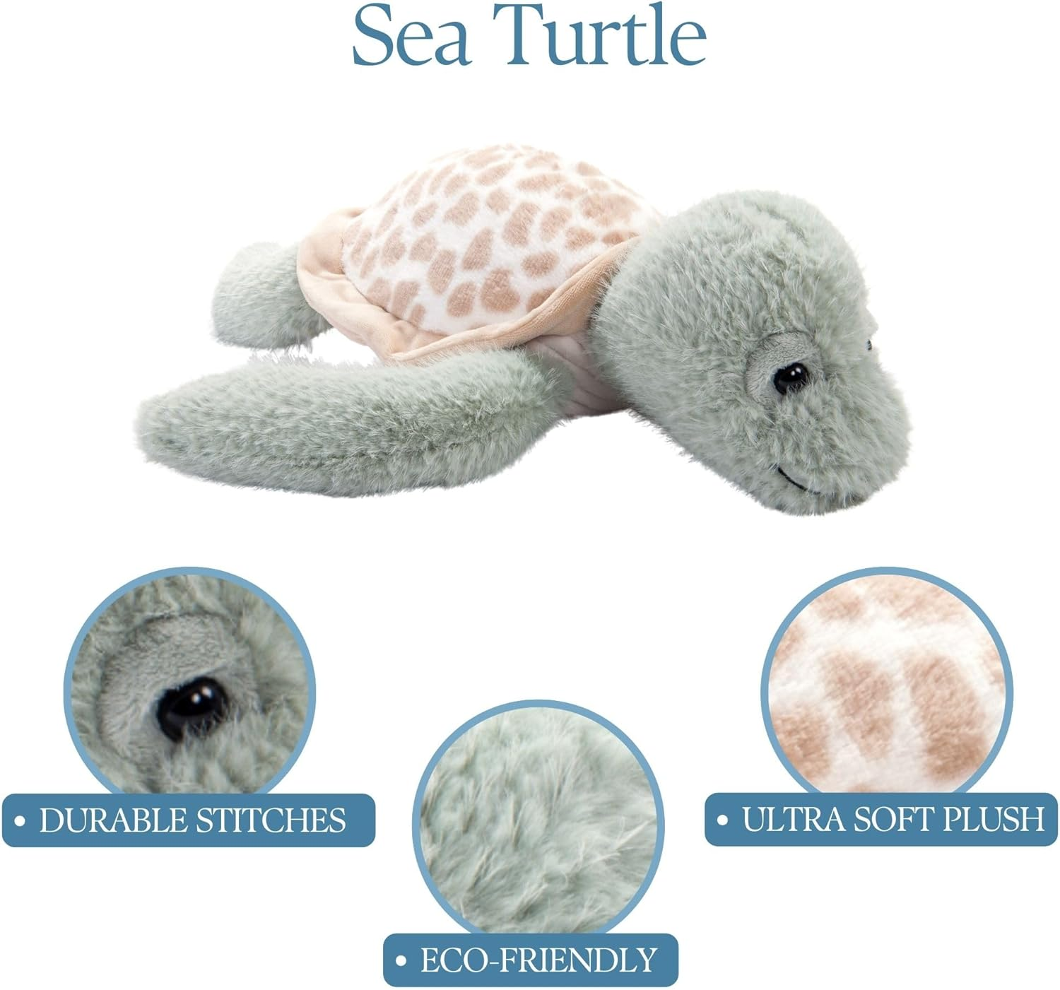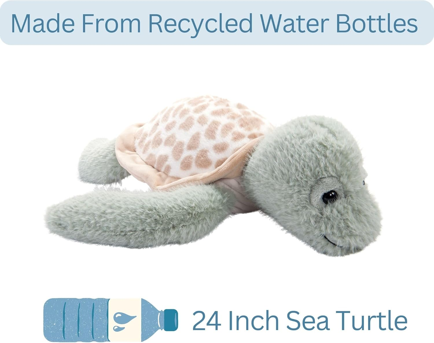 With soft fuzzy green material and a spotted shell, this sea turtle plush toy is the perfect companion for ocean-inspired fun. The soft cuddly body, bulging head and big smile of this realistic stuffed animal sea turtle is clearly a crowd pleaser for all ages. Fuzzy and soft stuffed animal sea turtles make great Christmas gifts for kids and birthday gifts for boys and girls. Win the race slow and steady with this cute turtle stuffed animal crafted with durable stitching and lifelike detailing. Combining play with Earth-sustaining practices, The Petting Zoo is committed to providing little ones with cute and cuddly plush toys that are made from recycled water bottles. Product description
