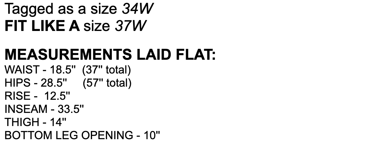Tagged as a size 34W FIT LIKE A size 37W MEASUREMENTS LAID FLAT: WAIST - 18.5'' (37'' total) HIPS - 28.5'' (57'' total) RISE - 12.5'' INSEAM - 33.5'' THIGH - 14'' BOTTOM LEG OPENING - 10''