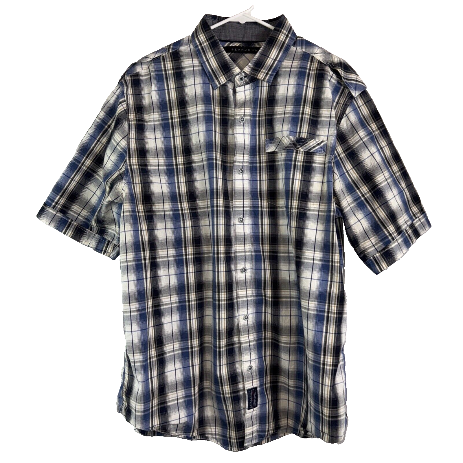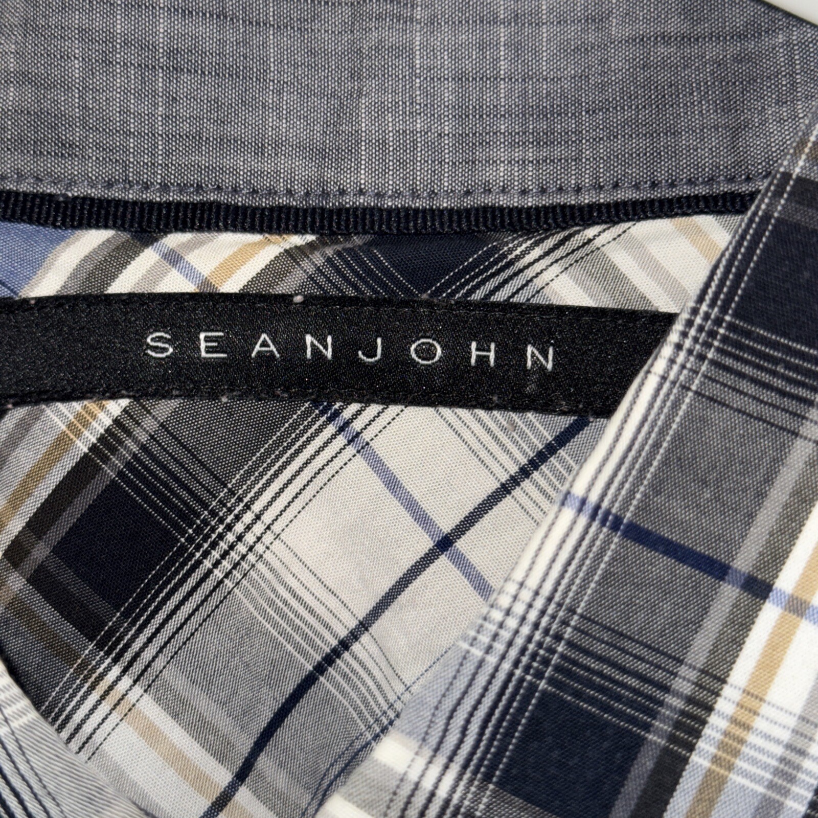 This plaid Sean John shirt has short sleeves and a button front. Good condition! No rips or stains. Men's X-Large XL Approximate Measurements: Armpit to Armpit - 25”; Shoulder to Hem - 27-31”