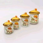 Add a touch of retro charm to your kitchen with this Sears Merry Mushroom 4 Piece Canister Set. The set includes four canisters and four lids, all of which are decorated with a colorful mushroom design. These canisters are perfect for storing dry goods like flour, sugar, and coffee, and will add a pop of color to your countertop. The canisters were made in Japan in the 1970s-80s Don't miss out on the opportunity to own this unique and collectible kitchen storage set. In excellent vintage condition with no major chips and no cracks. Please see photos, the 2nd largest lid has a small nick on the lid and the 3rd largest has a small chip on the rim of the canister.