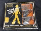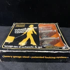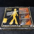 Introducing the Sears Wheel Away Convertible Caster Kit, a must-have for any traveler or vintage luggage collector. This versatile kit is brand new and still in its original packaging. It is perfect for those looking to add mobility to their luggage or to restore the original wheels on their vintage pieces. With the ability to convert any luggage into a rolling case, this kit is a game-changer for those constantly on the go. The kit includes everything needed for easy installation, and its high-quality construction ensures long-lasting use. Don't miss out on this opportunity to upgrade your travel gear! Unused in vintage packaging. 2 sets available sold separately