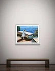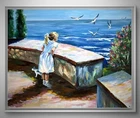 This beautiful hand-painted artwork captures a serene seaside scene, featuring a young girl gazing thoughtfully at the ocean waves. Dressed in a flowing white dress, she stands near a stone railing, accompanied by a small white cat at her feet. The vibrant blue sea is alive with gentle waves and soaring seagulls, while colorful flowers add a touch of warmth to the composition. This painting evokes a sense of calm and nostalgia, making it a perfect addition to any home or office decor. Details: Medium: Oil on canvas Style: Impressionistic Frame: Included, elegant white Dimensions: [40*50] Condition: Brand new, ready to hang This artwork is ideal for lovers of seaside landscapes, impressionist paintings, or those looking to add a touch of tranquility to their space. A unique piece that invites peaceful reflection.