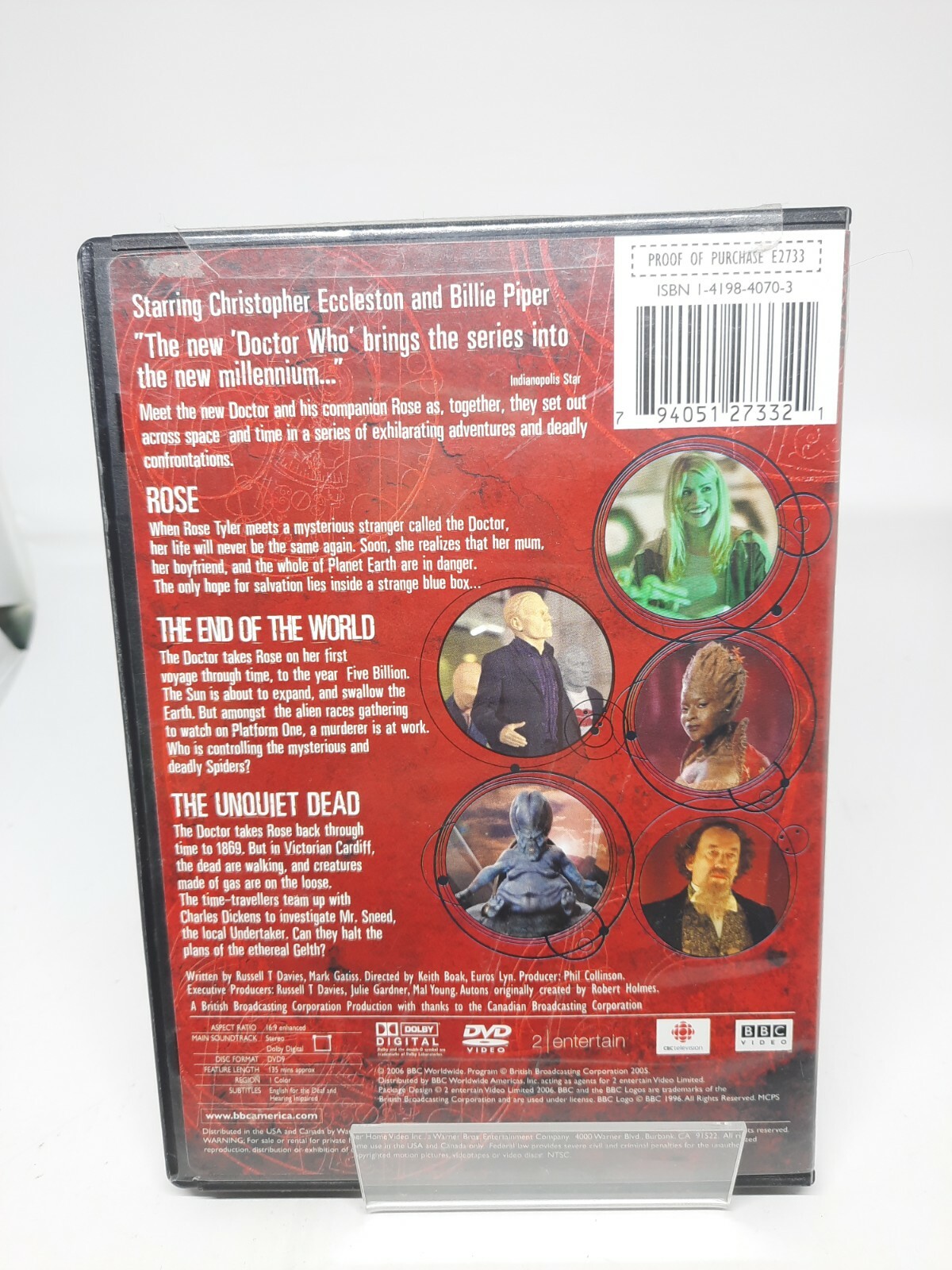 Vol. 1-Season 1-Rose/End of World/Unquiet Dead DVD. Disc is in good condition. No insert. Tape and minor dent to plastic slipcover. No cardboard slipcover to DVD