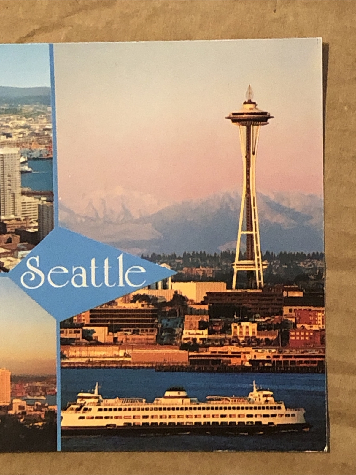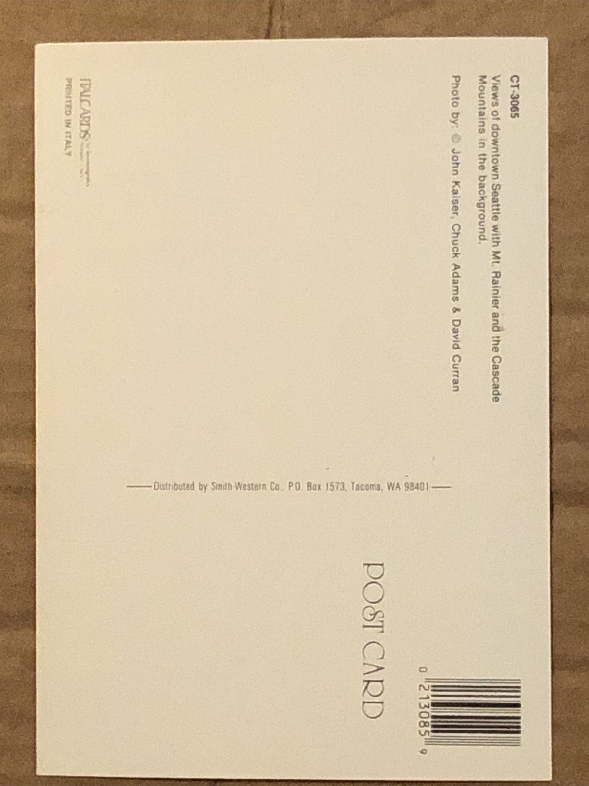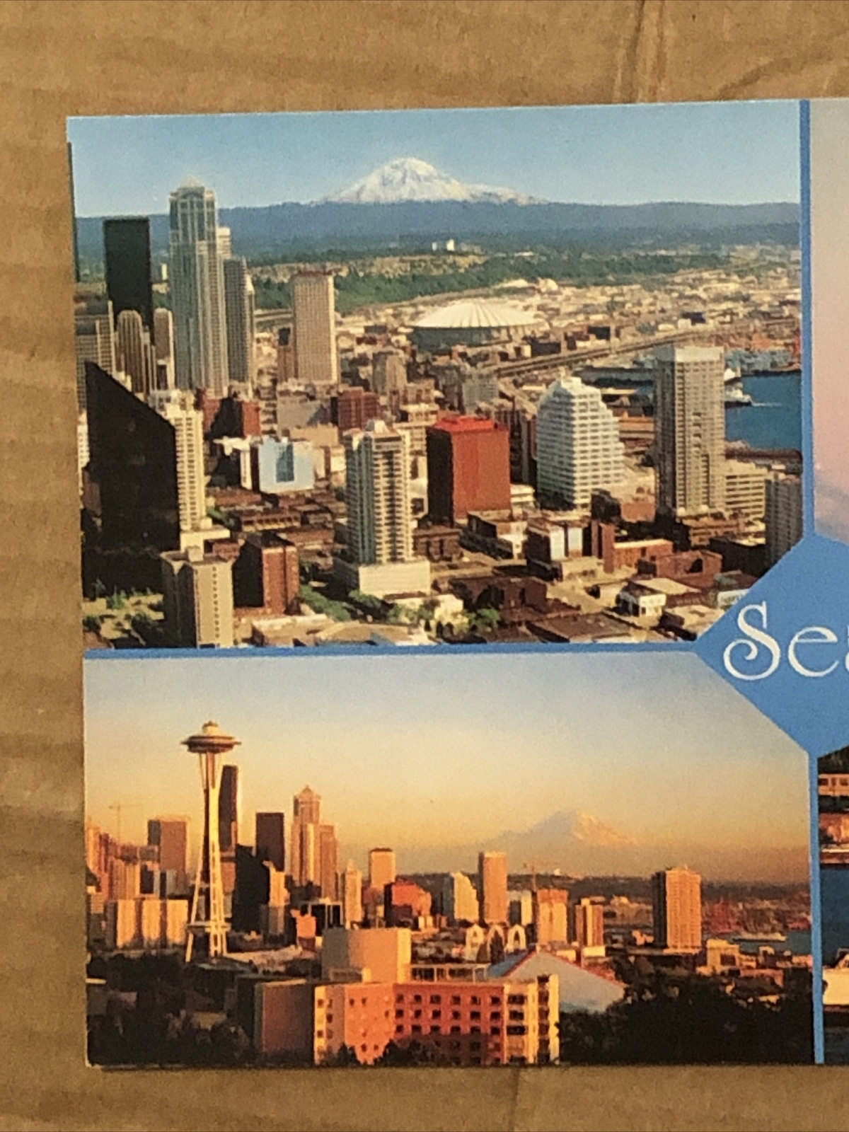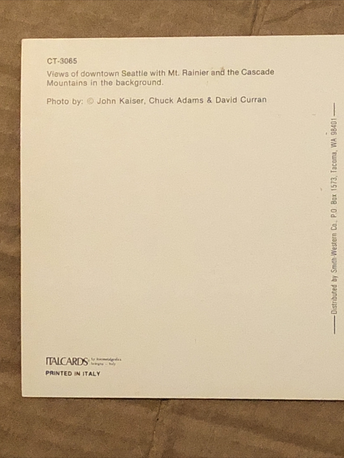 This product is a single continental (6x4 in) printed postcard featuring a multi-view of downtown Seattle, including the Space Needle and Mount Rainier. The postcard is an original chromolithograph from the USA, specifically Washington state. It is a collectible item that captures the essence of the city and its landmarks, making it a desirable piece for postcard collectors interested in North American cities and towns. The postcard showcases iconic Seattle features, such as the Cascade Mountains and the Space Needle, making it a visually appealing and meaningful addition to any collection.