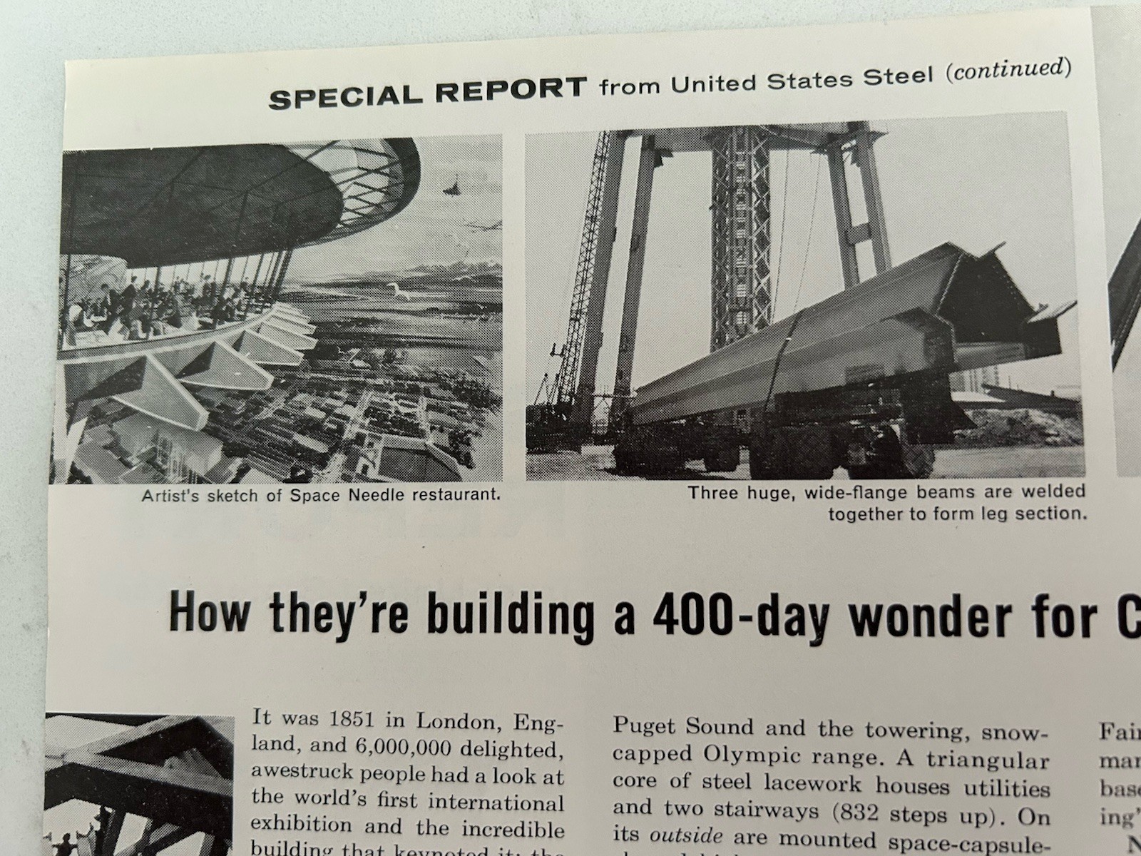 Seattle World’s Fair 1962 Space Needle Progress History U.S. Steel Report. 3 page report with corner crease