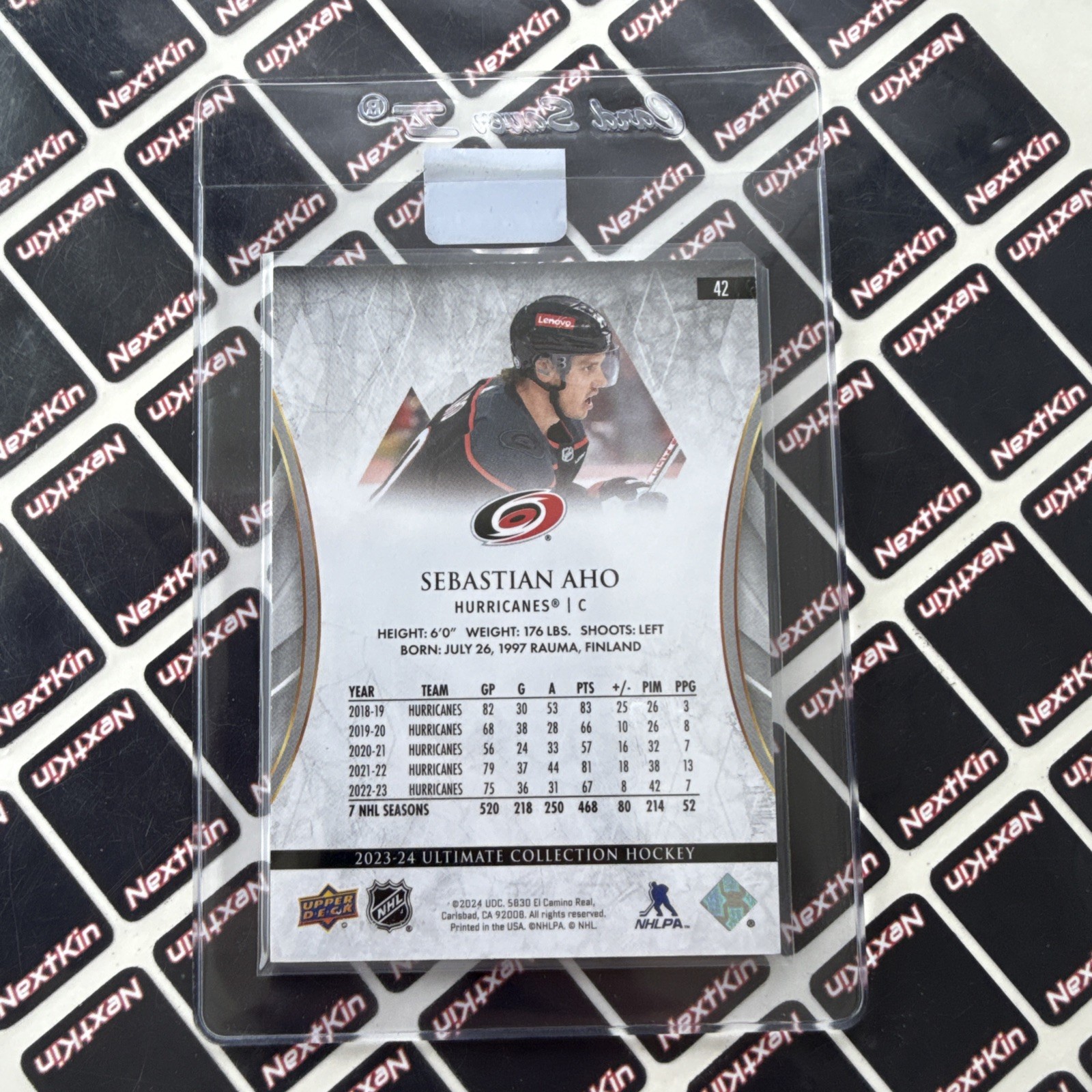 Experience the thrill of adding a piece of ice hockey history to your collection with the Sebastian Aho 2023-24 Upper Deck Ultimate Collection Hockey card, numbered #42. This card, from the highly sought-after 2023-24 Upper Deck Ultimate Collection, features the Carolina Hurricanes' star player and is a must-have for fans and collectors alike. With only 149 copies in existence, this limited-edition sports trading card is enhanced by an authentic autograph from Sebastian Aho himself. A standout piece commemorating an NHL season, it celebrates both the athlete's prowess and the collector's passion for the sport.