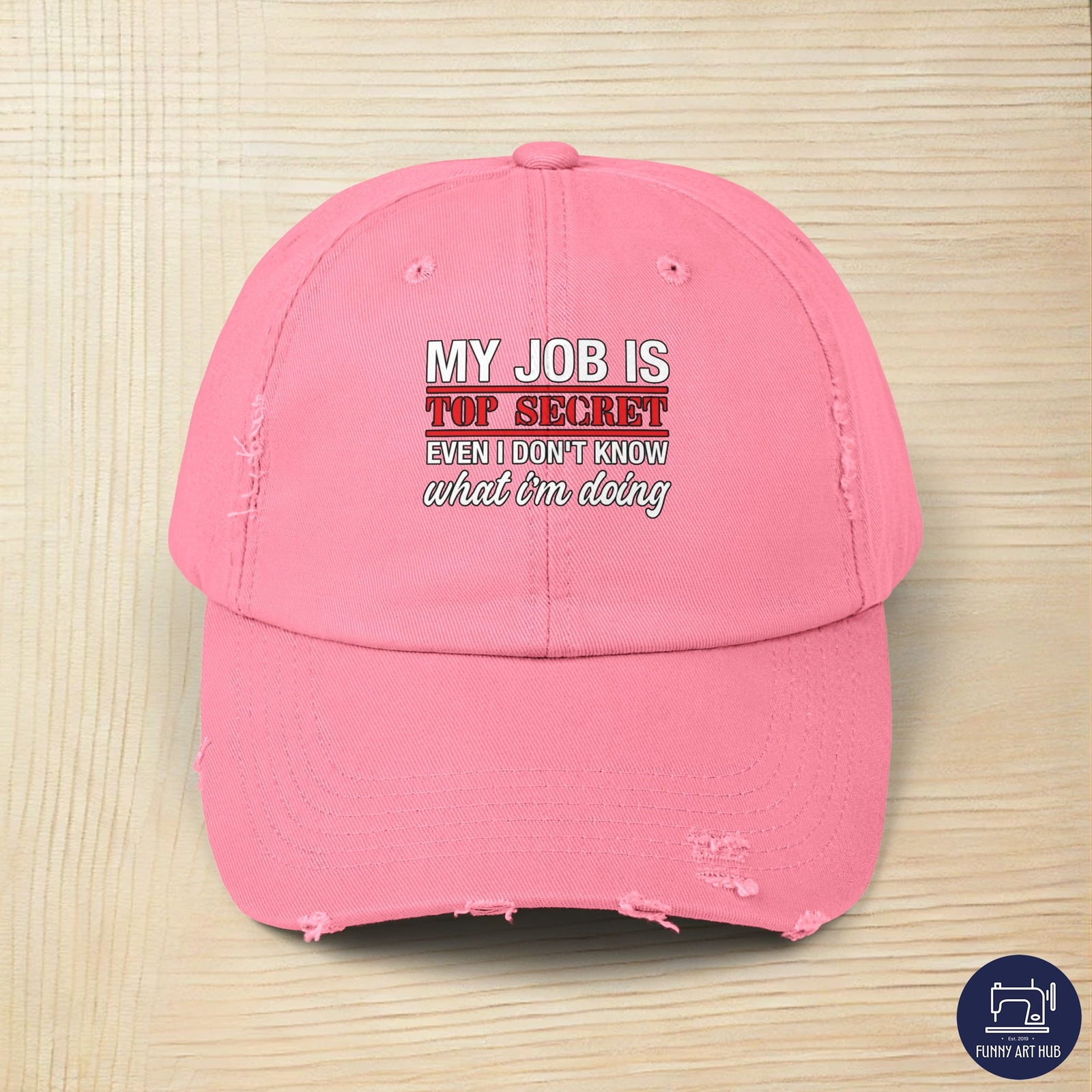 My Job IS TOP Sectret I Don't Know What I'm Doing is cool and funny gift for men, mind, women and kids who love Top Secret Job, funny, cool, gift,Job, TOP Secret, Funny Saying, Humorous Message, Playful Joke, Office Humor, Lighthearted Statement, Classified Information, Tongue-in-Cheek, Work Life, Job Secrecy, Playful Teasing, Office Wit, Mysterious Profession, Workplace Humor, Job Secrecy, Light-hearted Office, Professional Banter, Comedic Slogan, Office Banter PRODUCT DESCRIPTION Made with 100% cotton twill for high-end comfort and durability, these custom distressed hats bring all the style and practicality one needs in daily life. The low profile along with the D-ring closure on a self-fabric hideaway strap ensures both proper protection from the sun and that perfect, adjustable fit. .: 100% cotton twill .: Sewn-in label .: Closure: self-fabric hideaway strap with metal D-ring slider .: Printed using Direct to Film (DTF) technology .: Please note: Due to a special finishing process, distress and color may vary SIZE GUIDE Imperial One size Crown height, in 6.50 Width of front panel, in 7.37 Bill length, in 2.87 Metric One size Crown height, in 16.51 Width of front panel, in 18.73 Bill length, in 7.30 PRODUCT DESCRIPTION Made with 100% cotton twill for high-end comfort and durability, these custom distressed hats bring all the style and practicality one needs in daily life. The low profile along with the D-ring closure on a self-fabric hideaway strap ensures both proper protection from the sun and that perfect, adjustable fit. .: 100% cotton twill .: Sewn-in label .: Closure: self-fabric hideaway strap with metal D-ring slider .: Printed using Direct to Film (DTF) technology .: Please note: Due to a special finishing process, distress and color may vary SIZE GUIDE Imperial One size Crown height, in 6.50 Width of front panel, in 7.37 Bill length, in 2.87 Metric One size Crown height, in 16.51 Width of front panel, in 18.73 Bill length, in 7.30