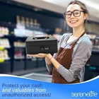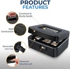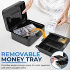 Serenelife 8" Metal Cash Box with Lock | Cash Safe Lock Box with Money Tray | 5 Lockable Drawers | Five Compartment Cash Tray | Storage for Valuables | 8” x 6.2” x 3.5” IN | Black DESCRIPTION ROBUST SECURITY AND DURABILITY - Rely on the lasting protection of this 8" cash box, meticulously crafted from strong steel. Our advanced lock, featured in this lock box for money, stands guard over your valuable items. EFFICIENT ORGANIZATION FOR YOUR VALUABLES - Experience hassle-free organization with the removable inner money drawer and a cash tray thoughtfully designed with five compartments. Accessing your cash and belongings from this cash box with a money tray. AMPLE STORAGE CAPACITY WITH PORTABILITY - Embrace the convenience of abundant storage space that this mini safe box for money provides. The spacious interior, designed for a cash box with money tray, accommodates your valuable items securely. PREMIUM SECURITY FOR PEACE OF MIND - Entrust your valuable possessions to the high-level security features of this cash holder. The advanced combination lock ensures that your items remain safeguarded in this money box. COMPLETE PACKAGE OF SECURITY AND CONVENIENCE - Unveil the perfect combination of security and convenience with this steel cash box. Measuring 7.8” x 6.2” x 3.5”, it's compact yet capacious, making it an exceptional money safe for cash-saving.