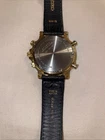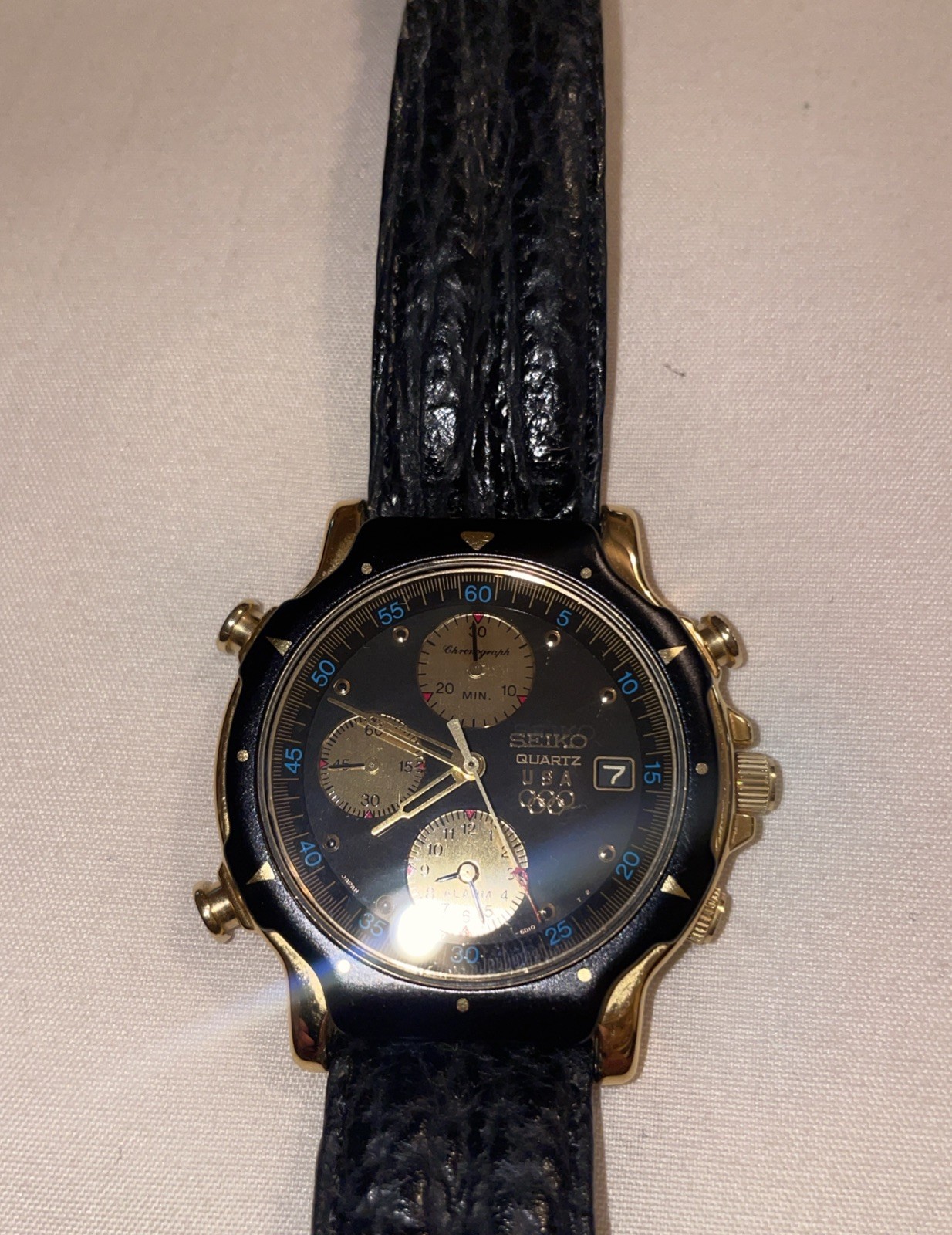 The Seiko 1992 Olympic Two Tone Chronograph Black & Gold Dial Watch is a vintage timepiece featuring a classic round watch shape with a gold plated case and black bezel. This men's wristwatch boasts a two-piece strap, screwback caseback, and multifunction chronograph features including a date indicator, 12-hour dial, and push/pull crown. The black and gold dial with round indexes adds a touch of elegance to this dress/formal yet casual watch, making it a stylish accessory for any occasion. Made in Japan with a quartz movement, this Seiko model is a timeless piece of luxury and craftsmanship. Has original band.