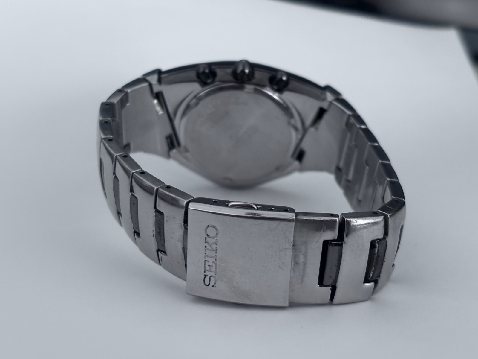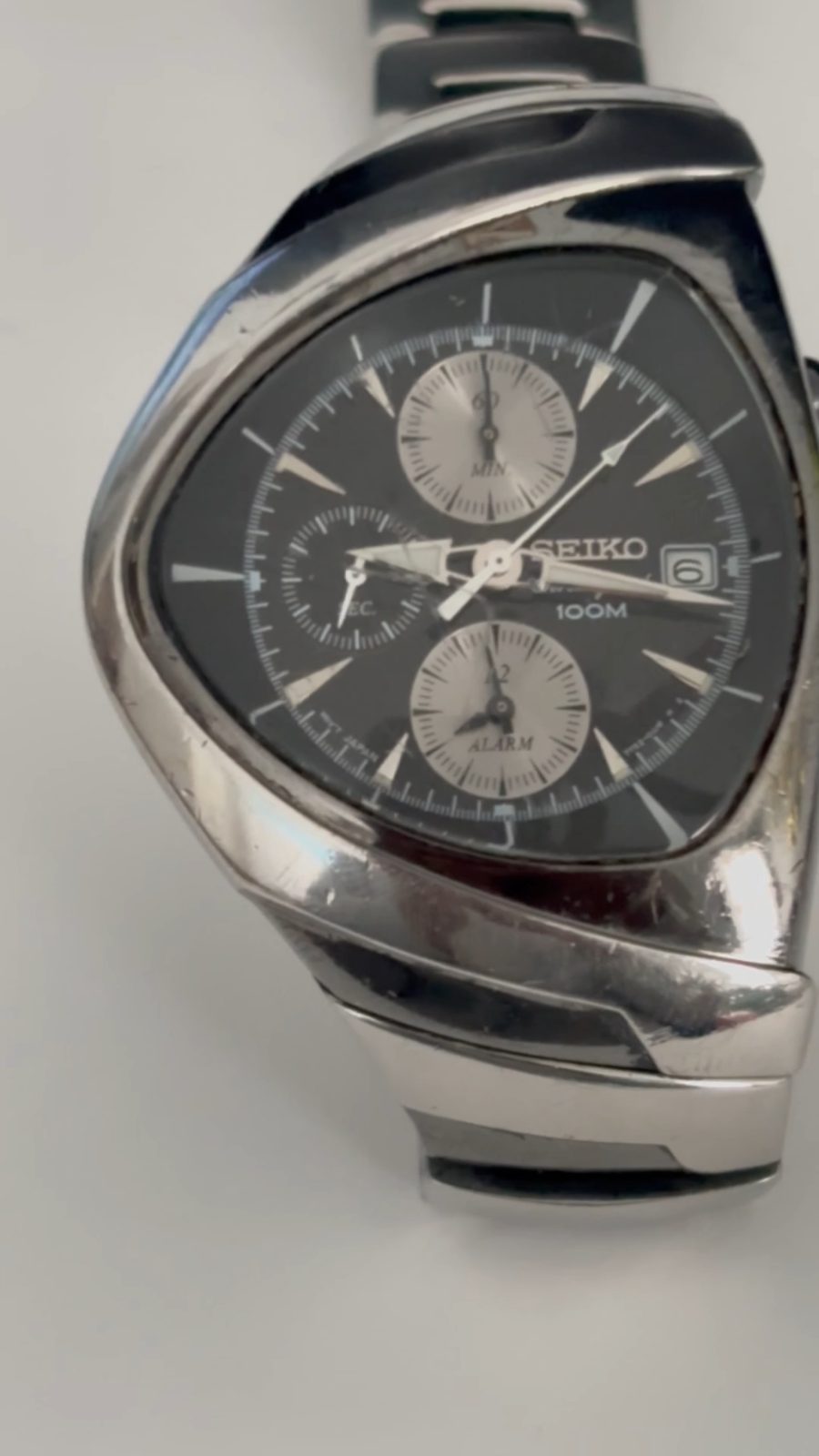 The Seiko Vintage men's wristwatch is a classic and casual timepiece featuring a black dial with an analog display. This stylish watch has a unique triangle watch shape and is equipped with quartz movement for accurate timekeeping. The stainless steel bracelet comes in a sleek silver and black color combination, complementing the overall design. Additionally, this watch boasts a chronograph feature, adding functionality to its elegant appearance, making it a great choice for everyday wear. THIS DESIGN WILL NEVER BE MADE AGAIN