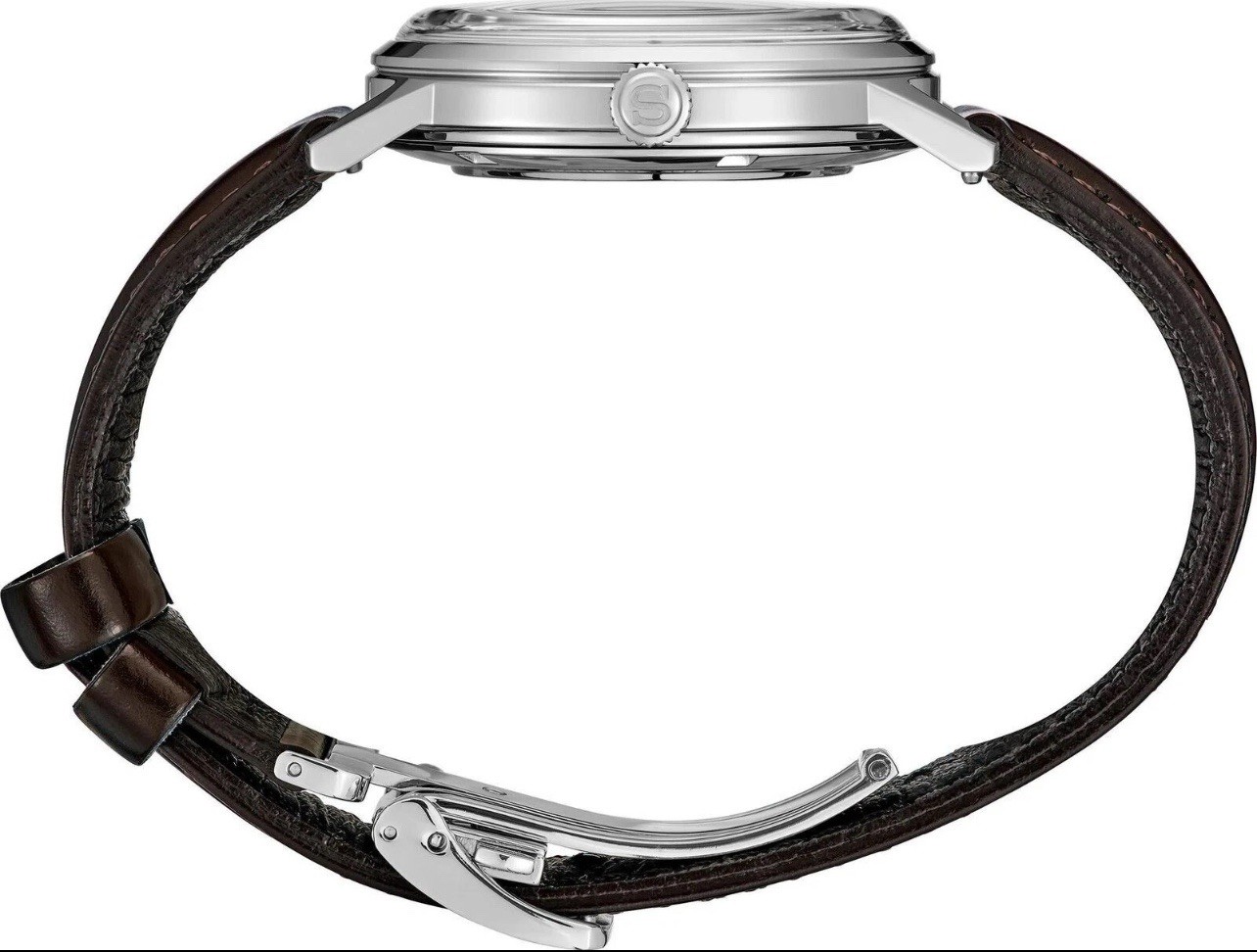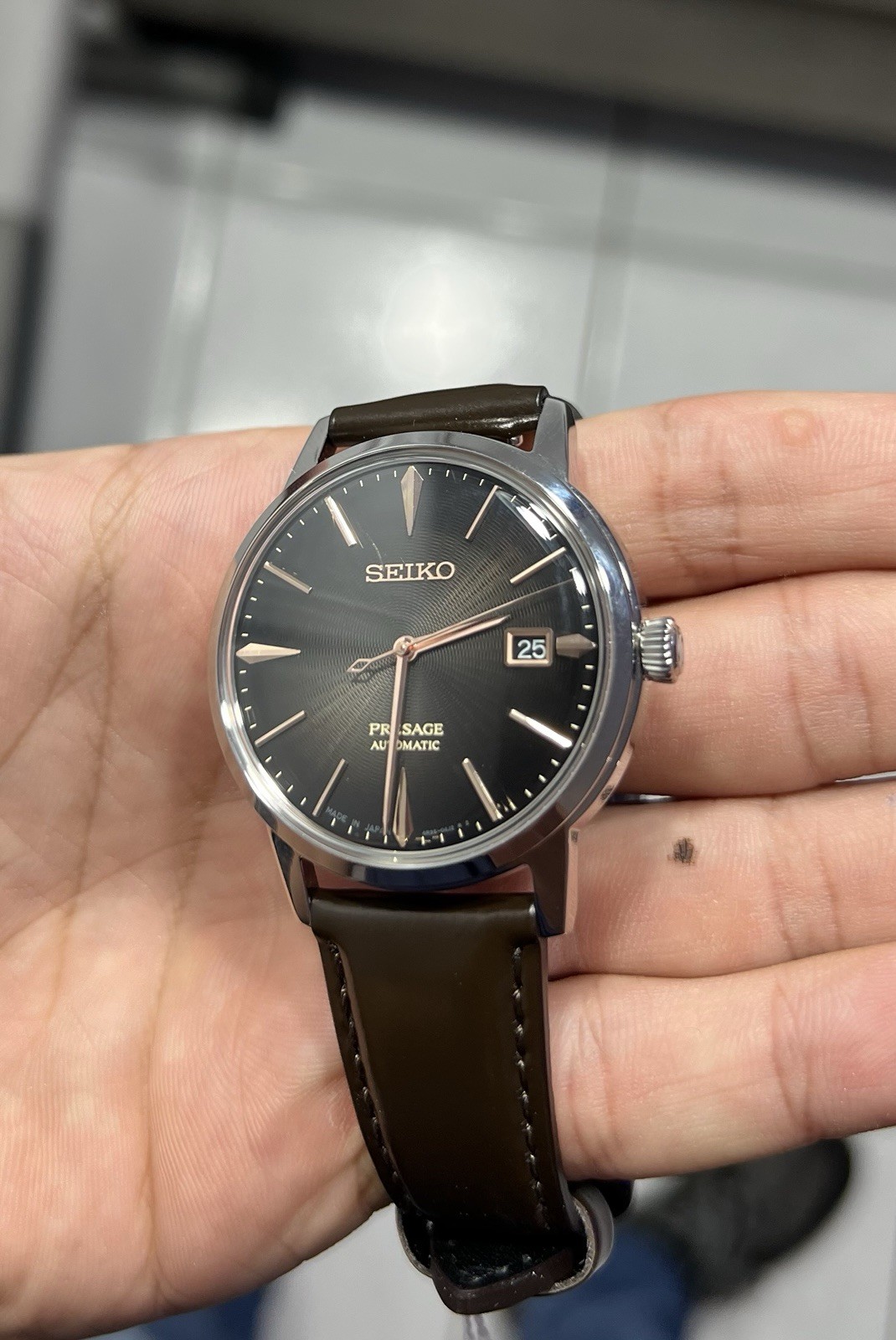 Inspired by Tokyo’s refined cocktail culture, the Seiko Presage SRPJ17 blends elegant design with the reliability of Seiko’s automatic craftsmanship. The rich brown sunburst dial plays beautifully with light, delivering depth and warmth that make this model stand out as one of the most sophisticated daily-wear choices in the Presage line. A domed Hardlex crystal, polished case surfaces, and signature Cocktail Time aesthetics come together to create a dress watch with timeless charm and exceptional value. ⸻ ✨ Specifications ** Has a small scratch on the case** • ⌚ Case: 40.5 mm stainless steel • 📏 Thickness: Approx. 12 mm • 🕰 Movement: Seiko 4R35 Automatic (manual winding + hacking) • 🔋 Power Reserve: ~41 hours • 🔢 Functions: Three-hand display + date window at 3 o’clock • 🌇 Dial: Brown sunburst with applied indices & dauphine hands • 🔍 Crystal: Box-shaped Hardlex • 💡 Lume: Lumibrite on hands and markers • 💦 Water Resistance: 50 meters • 🪶 Strap: Brown leather strap with stainless-steel buckle • 🪞 Caseback: Exhibition (see-through) • 🎁 Included: Watch + box + cushion • 🪙 Retail Price: $450 • 🔧 Origin (Movement): Japan