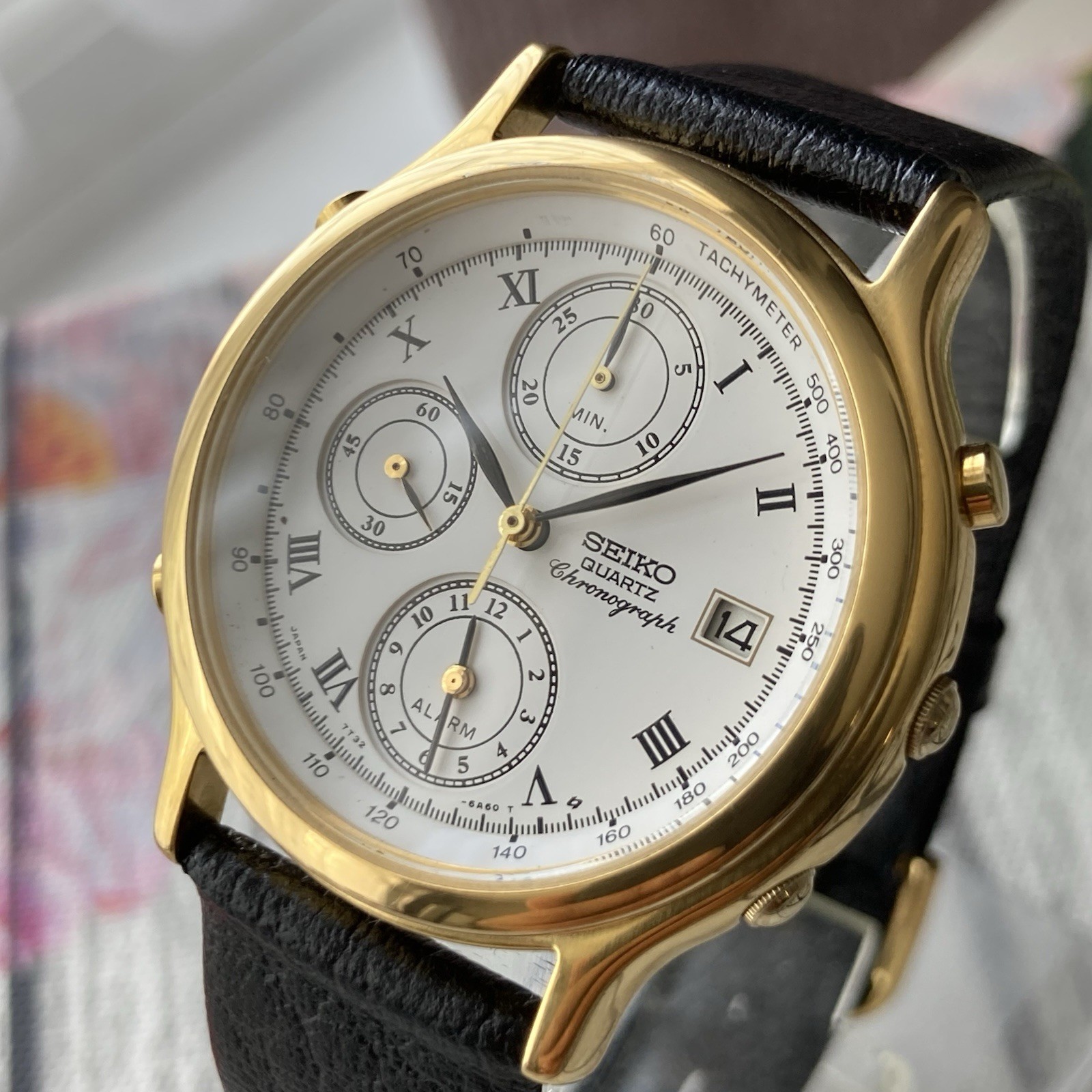 Seiko Watch 7T32 Vintage 1990s White Dial Chronograph Gold Plated 37mm Case. A stunning vintage gentlemans timepiece featuring a white dial detailed with black Roman hour marked and hands. Functions include date, chronograph, alarm and seconds counter at the 9 o’clock positioned subsidiary dial. The watch is in excellent condition for pre-owned and age negligible signs of use. A fresh battery has been installed and is in perfect working order. New old stock Apollo leather strap. The case measures approximately 37mm excluding the crown. no original box or papers. PLEASE NOTE DUE TO CUSTOMS, DELAYS AND LOST POST I DO NOT SHIP TO AFRICA, ITALY, SOUTH AMERICA, ISRAEL, GERMANY, PHILIPPINES AND SOME OTHER LOCATIONS SO PLEASE CONFIRM YOUR LOCATION BEFORE BIDDING. PLEASE NOTE WE DO NOT GUARANTEE WATERPROOF ON ANY VINTAGE WATCH UNLESS STATED IN THE DESCRIPTION.