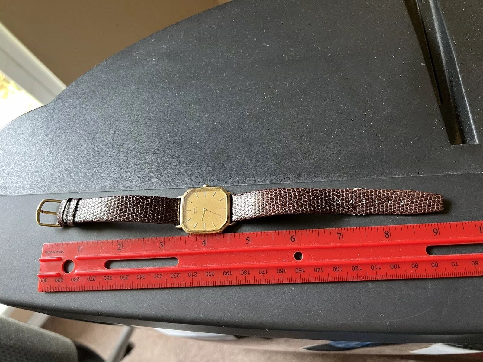 Vintage men’s Seiko quartz watch . Band has some wear, watch is not running. Back has scratches .