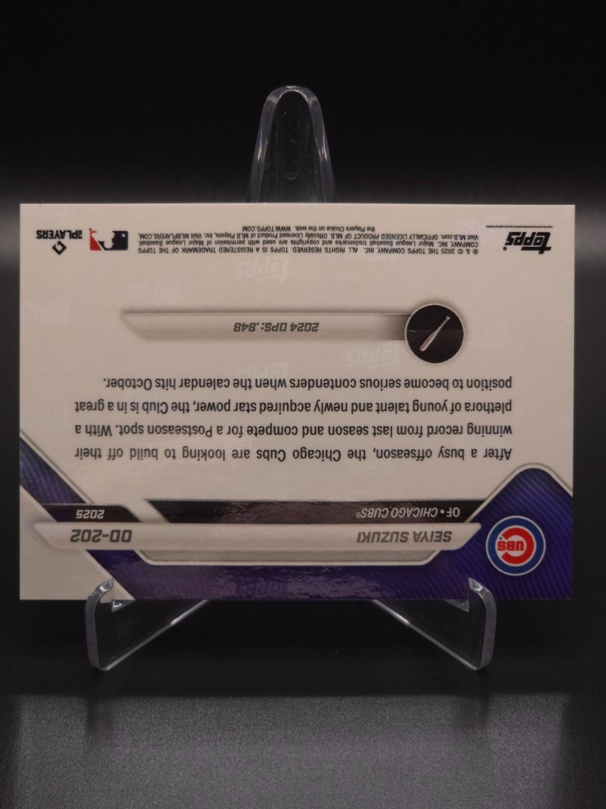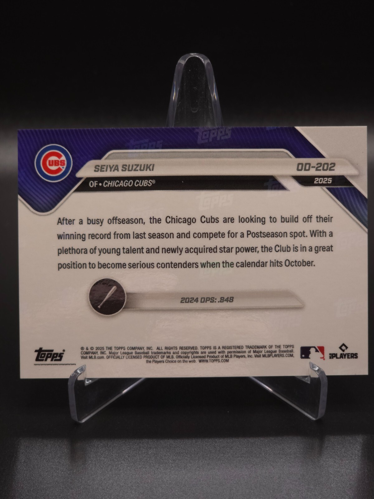 Seiya Suzuki 2025 Topps Now Road To Opening Day Chicago Cubs Green #80/99 NOTE: Stand shown in photos not included. Payment: Payment for all purchases is due within 72 hours. For International Buyers: I do not charge duty/taxes/customs fees because I have not control over whether or not your respective country will charge such a fee. As a result, I will not reimburse for assessed duty/taxes/customs fees if charged. Combined Shipping: I do offer combined shipping. In most cases, it will be $0.50/card after the initial main card shipping purchase. If the combined shipping was not available in the shopping cart, I will gladly provide a refund upon shipping preparation. If you placed an order for additional cards before first order shipped, I will add additional cards with combined shipping. What Shipping Pays For: - If Raw Card: Penny Sleeve, Top Loader, Team Bag, Cardboard Shipping Protectors, Painter's Tape, and Bubble Mailer with Shipping Tracking in most cases. - Ask about a cheaper shipping option! - If Graded Card: Team Bag, Cardboard Shipping Protectors, Painter's Tape, and Bubble Mailer with Shipping Tracking in most cases. Shipping Restrictions: Due to incoming shipping restrictions, global shipping will not mail to the following countries: Barbados, French Guiana, French Polynesia, Guadeloupe, Libya, Martinique, New Caledonia, Reunion, Russian Federation, Ukraine, Venezuela.