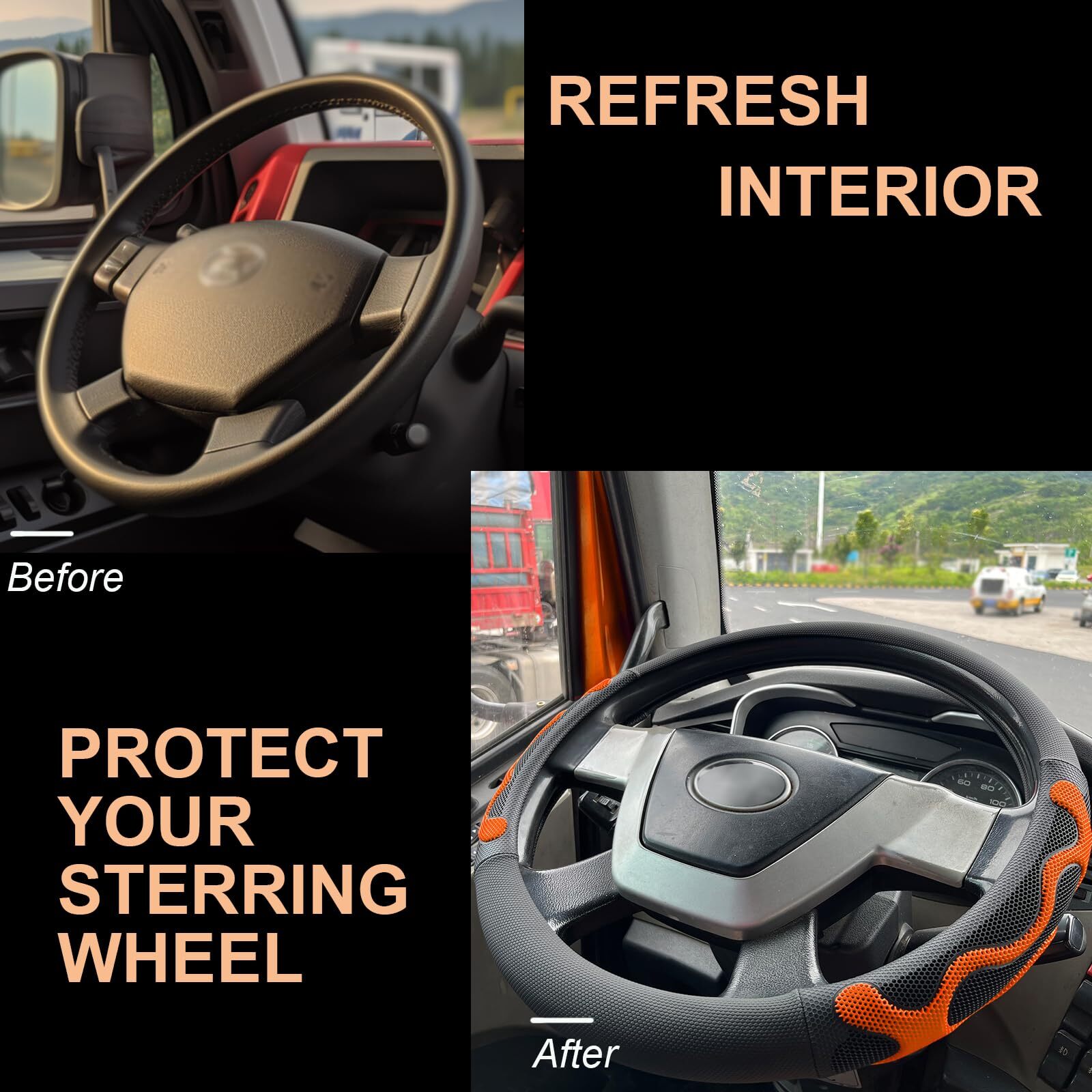 XL Size 17.5-18 Inch Comfy Grip Steering Wheel Cover for Semi Truck, Fits RV, Big Rig Trucker, 18 Wheeler and Classic Cars, Anti-Slip Design 17.5-18 Inch(Silicone Orange) Enhanced Comfort and Secure Grip: The car steering wheel cover offers an exclusive blend of comfort and reliability. It grips your steering wheel firmly. With its ergonomic design and soft, flexible silicone, it offers a comfortable hand feel, reducing hand fatigue even during long drives. Built to Last: Crafted with a solid rubber inner circle, textured microleather leather, and a 3D honeycomb silicone grip, this cover boasts a unique material combination that ensures exceptional durability. The silicone grip effectively relieving sweaty hands under hot weather. Enjoy a long-lasting and comfortable grip with car steering wheel cover. Refresh Your Vehicle's Interior: Give your steering wheel a quick and stylish refresh with cover. With a wide range of color options available, you can easily find the perfect match to coordinate. Preventing any potential scratches caused by sharp objects like fingernails. Size Guidelines: offers a range of options for steering wheel cover, including four sizes: small, medium, large, and X-large, as well as two shapes: round and D-shaped (with a flat bottom). The size you have selected is the X-LARGE cover, designed specifically for X-LARGE size steering wheels with an outer diameter of 17 1/2 to 18 inches (44.4-45.7cm). Before making your purchase, we kindly advise you to carefully measure the size of your steering wheel to ensure a proper fit. Installation Instructions: The steering wheel cover is designed to be flexible and snug-fitting. During installation, please exert some force to ensure a secure fit. This cover made to fit 17.5 - 18 Inch Steering Wheels found in 18 Wheelers, Semi Trucks, Tractor Trailers, RVs, Rig Trucks, Container Trucks, other Large Vehicle and old classic antique cars. XL Size 17.5-18 Inch Comfy Grip Steering Wheel Cover for Semi Truck, Fits RV, Big Rig Trucker, 18 Wheeler and Classic Cars, Anti-Slip Design 17.5-18 Inch. The Accessories Fit Most X-Large Size Steering Wheels of Outer Diameter 44.4-45.7cm/17.5-18 inch. Compatible with Freightliner Cascadia Columbia FL112 M2; Compatible with Western Star; Compatible with Kenworth; Compatible with International LT trucks; Compatible with Motorhome; Compatible with Volvo VNl; Compatible with Peterbilt model 389 567 Pete 579; Compatible with Mack Dump Truck; Compatible with 1942 Ford super deluxe; Compatible with Old Classic Antique Cars; Compatible with Newmar Mountain Aire Diesel Pusher; etc. Shipping We offer FREE shipping on all orders! We ship within Three business days of payment, usually sooner. We use a selection of shipping services such as UPS, FedEx, USPS etc. We only ship to the lower 48 states, no APO/FPO addresses or PO Boxes allowed. Local pickups and combined shipping options are not provided at this time. Return You can return a product for up to 30 days from the date you purchased it. Any product you return must be in the same condition you received it and in the original packaging. Please keep the receipt. Payment We accept payment by any of the following methods: PayPal Please pay as soon as possible after winning an auction, as that will allow us to post your item to you sooner! Feedback Customer satisfaction is very important to us. If you have any problem with your order, please contact us and we will do our best to make you satisfied. Contact Us If you have any queries, please contact us via ebay. We usually respond within 24 hours on weekdays. Please visit our eBay store to check out other items for sale! Thank you for shopping at our store.